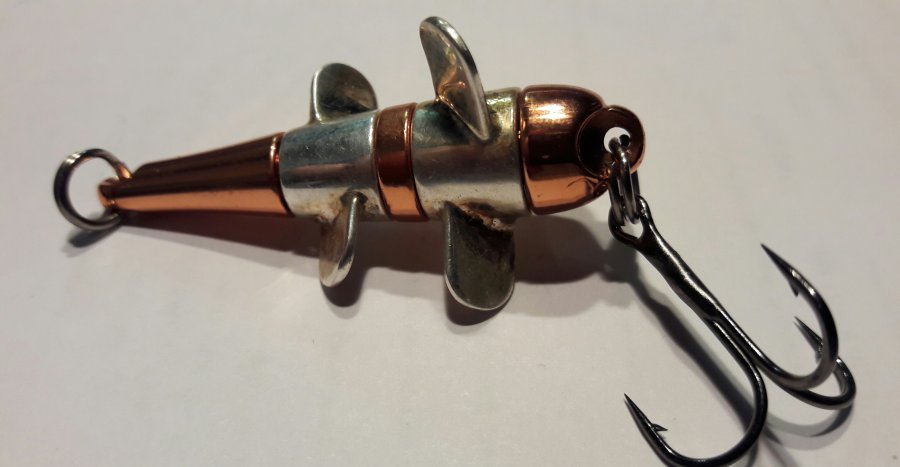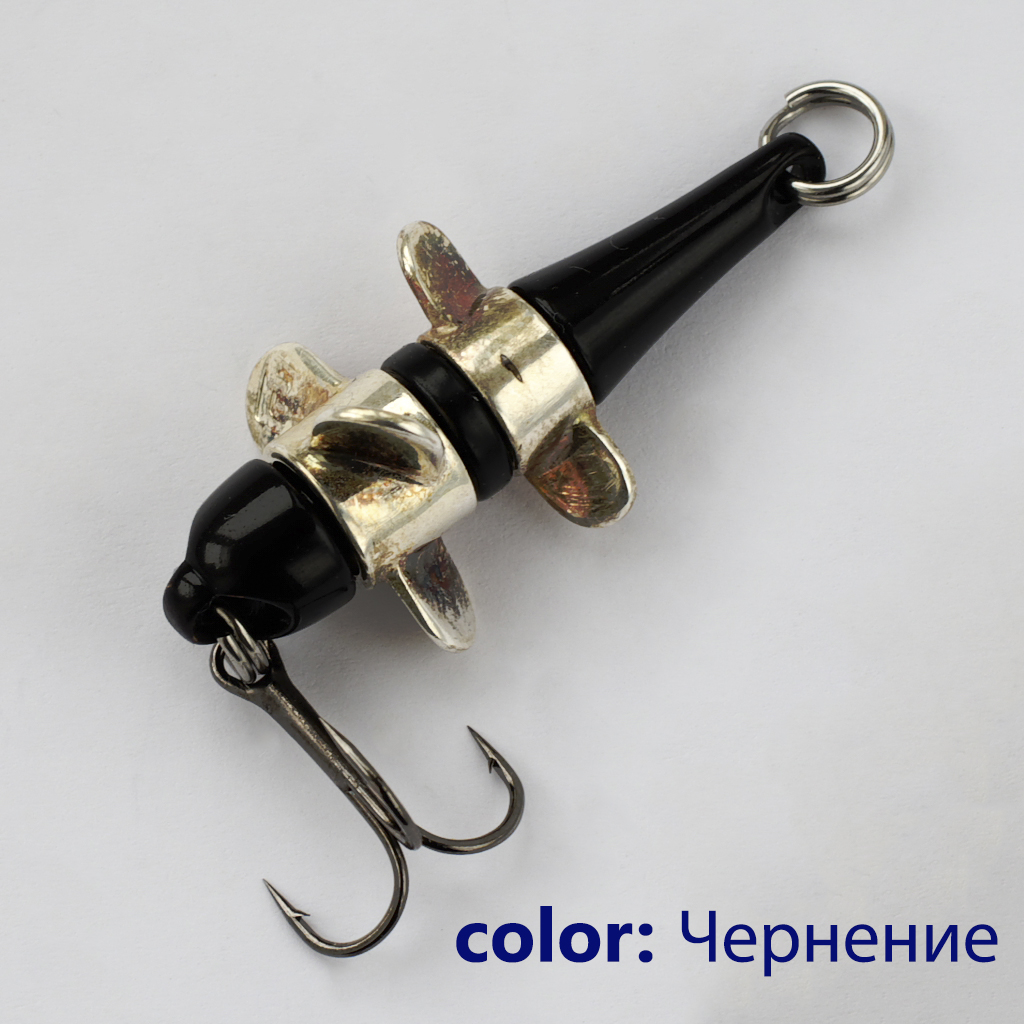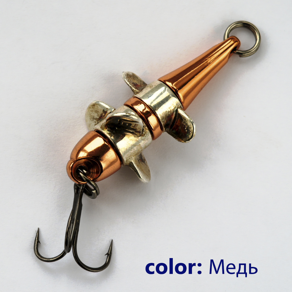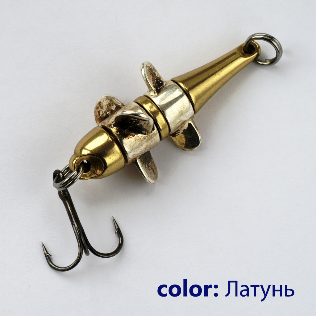 Очень интересная приманка для ловли жереха.Две турбины крутятся а противоположные друг от друга стороны,тем самым предотвращают закручивание шнура.Корпус изготовлен из латуни,а турбины покрыты серебром.Применяются высокоточные нержавеющие шарикоподшипники.