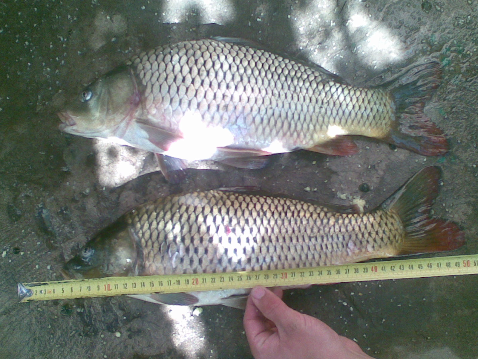 Но 8 августа после прибытия со ставка я поехал на Дачу в с.Крынки и сразу же пошел на берег глянуть ситуацию что ловят. Взял два спининга оставшуюся кашу пришел на берег унас есть там мост деревянный на островок небольшой. Забросил а время было уже 13:00 как раз пришли на водопой коровы. Даже не надеясь на поклевку минут через 30 вытащил карасика. после было три обрыва так как не взял подсаку.Уже было растроился и собирался идти на дачу тут детишки кричат у вас клюет я смотрю а спиниг Крокодил согнулся на пополам бегом подсекаю после 10 мин борьбы вытащил Карпа 2кг, но слазил за ним в воду по грудь. Следом мин через 15 сново достал карпа на 2кг300гр. И я сделал вывод что больше ни когда не поеду на платные ставки.
