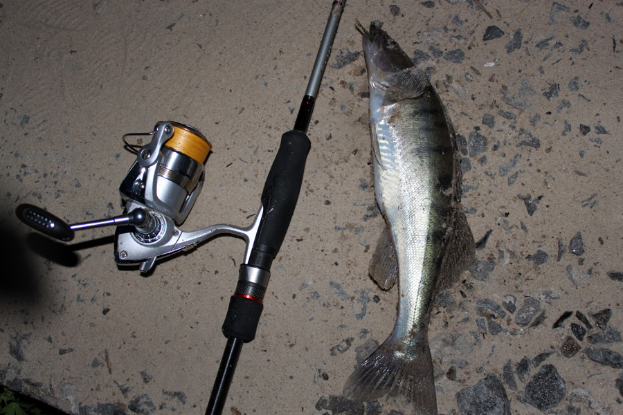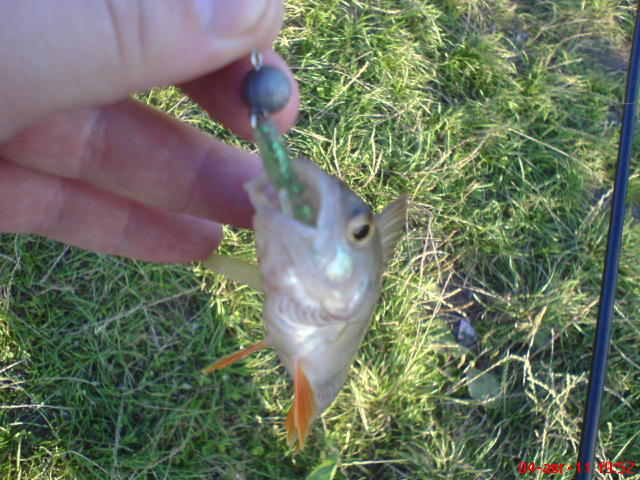 Окунь начал брать у меня сразу, но мелкий и был один судачий прижим. Я перешел к Самураю и мы начали облавливать точку. Перейдя на съедобку, я сразу ощутил удар и судачок около 300гр. оказался на берегу:1_0072:. Через несколько минут попался окунь около 150гр…
