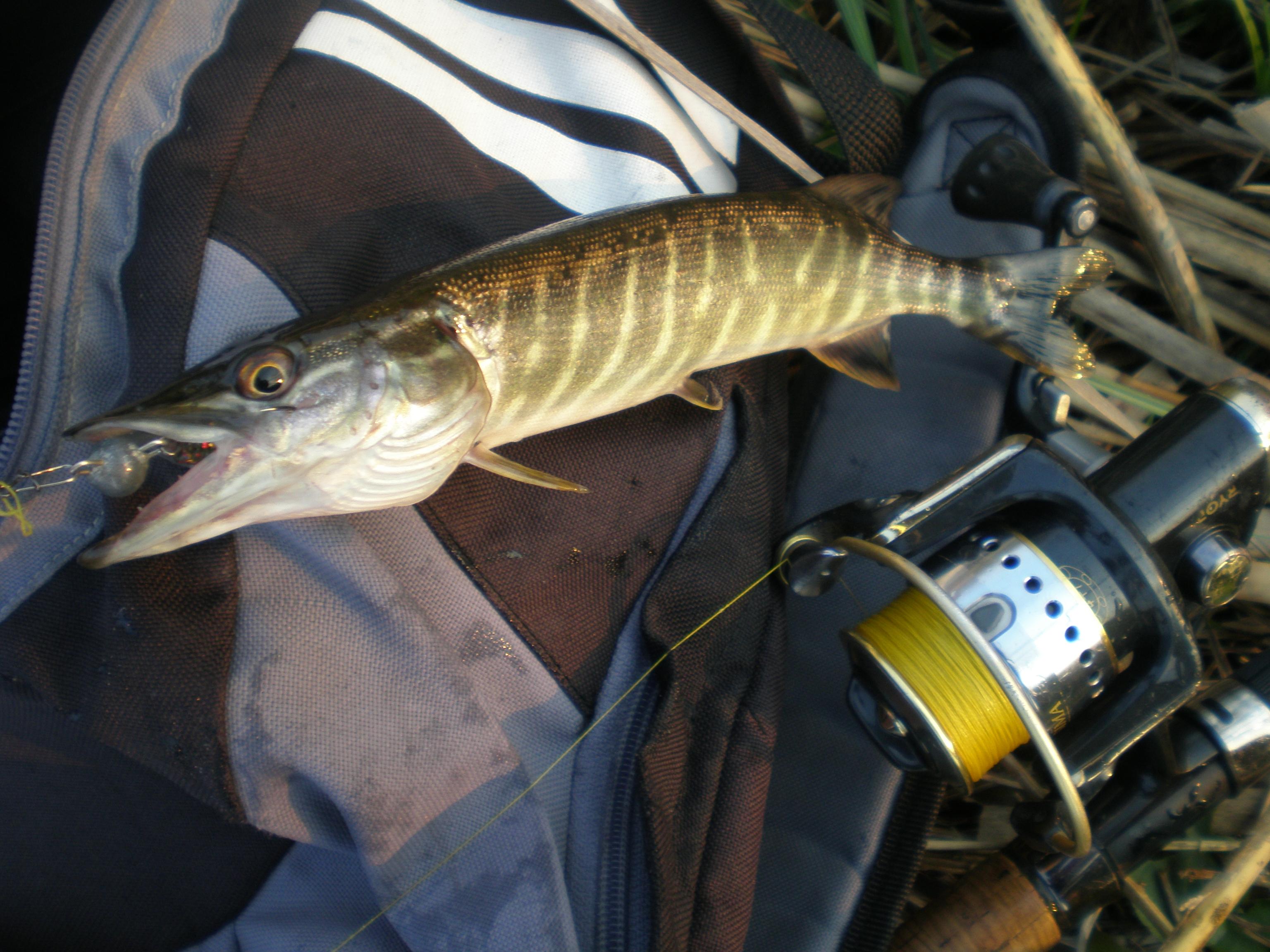Прошло немного времени и я почувствовал удар...промах..еще один удар...и непривычная тяжесть и упорное сопротивление...поводка не было и я начал побыстрее подтягивать рыбу...немножко расстроил тот факт,что вместо громадной рыбины я извлек засеченную за спину щучку 600гр.Но всеравно палку обрыбил:1_0072:. и впрыс адреналина получил...