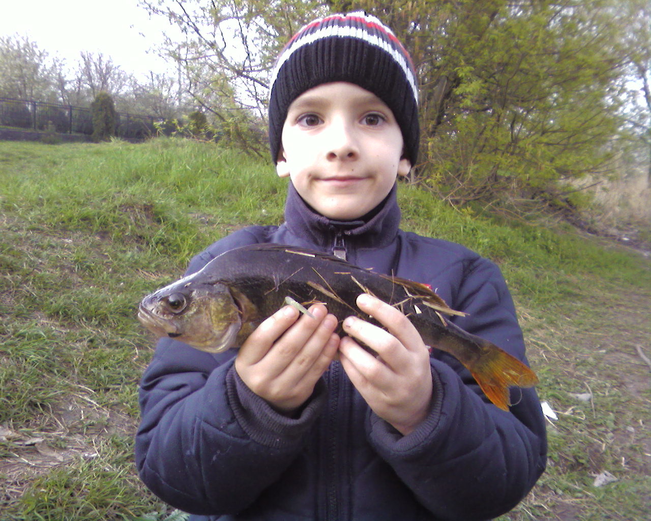 Делаю пару забросов и чуствую приятную тяжесть. Фрикцион запел, но понимаю что это окунь и неплохой. Он пытался уйти на глубину в траву, пришлось поджать фрикцион(листья кувшинок уже распустились и лежат сплошным ковром над дном). Визгу было(у сына радость ).
