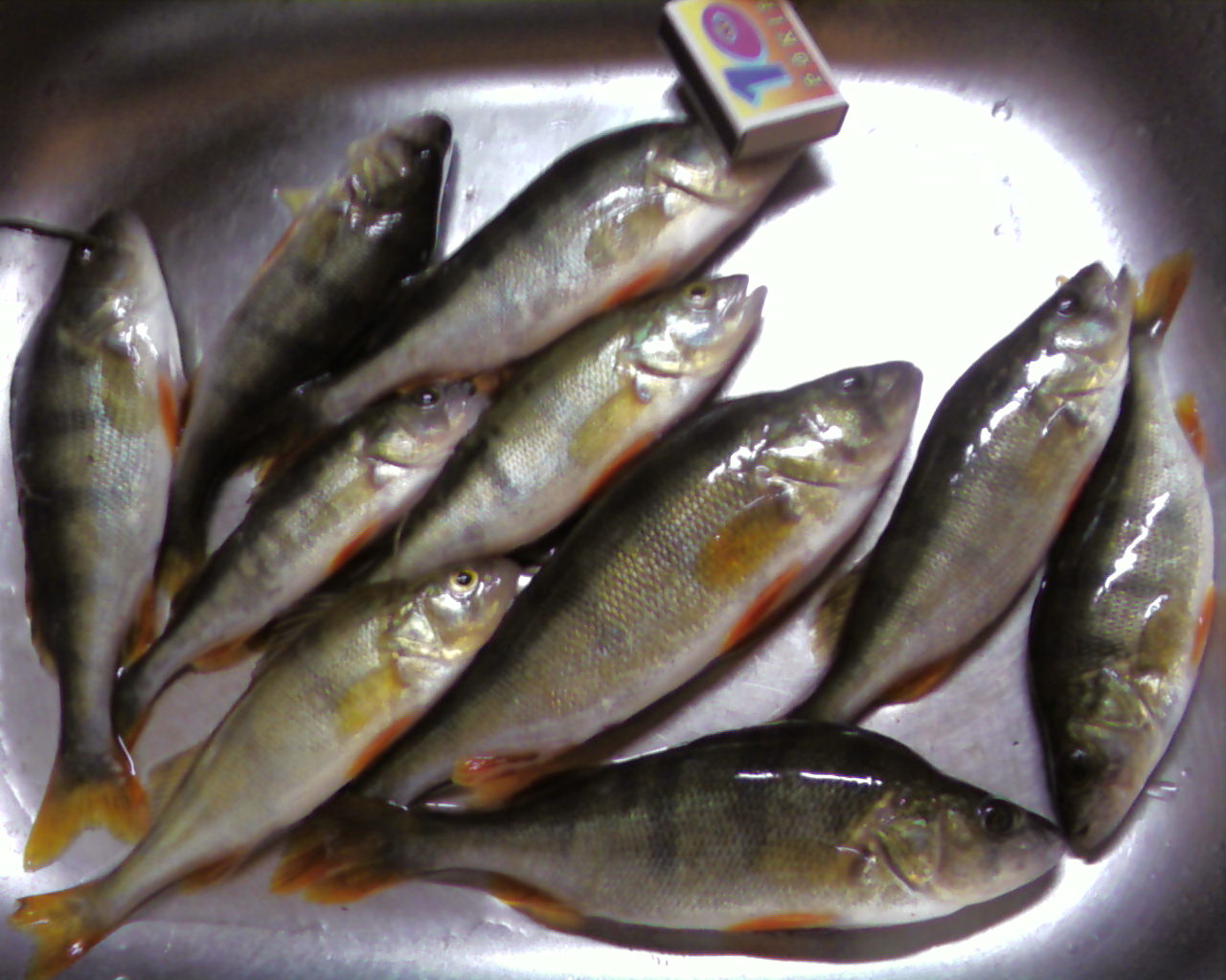 Дальше дело пошло,сынуля самостоятельно вымотал из воды трёх окуней, ну и я пару штук.
