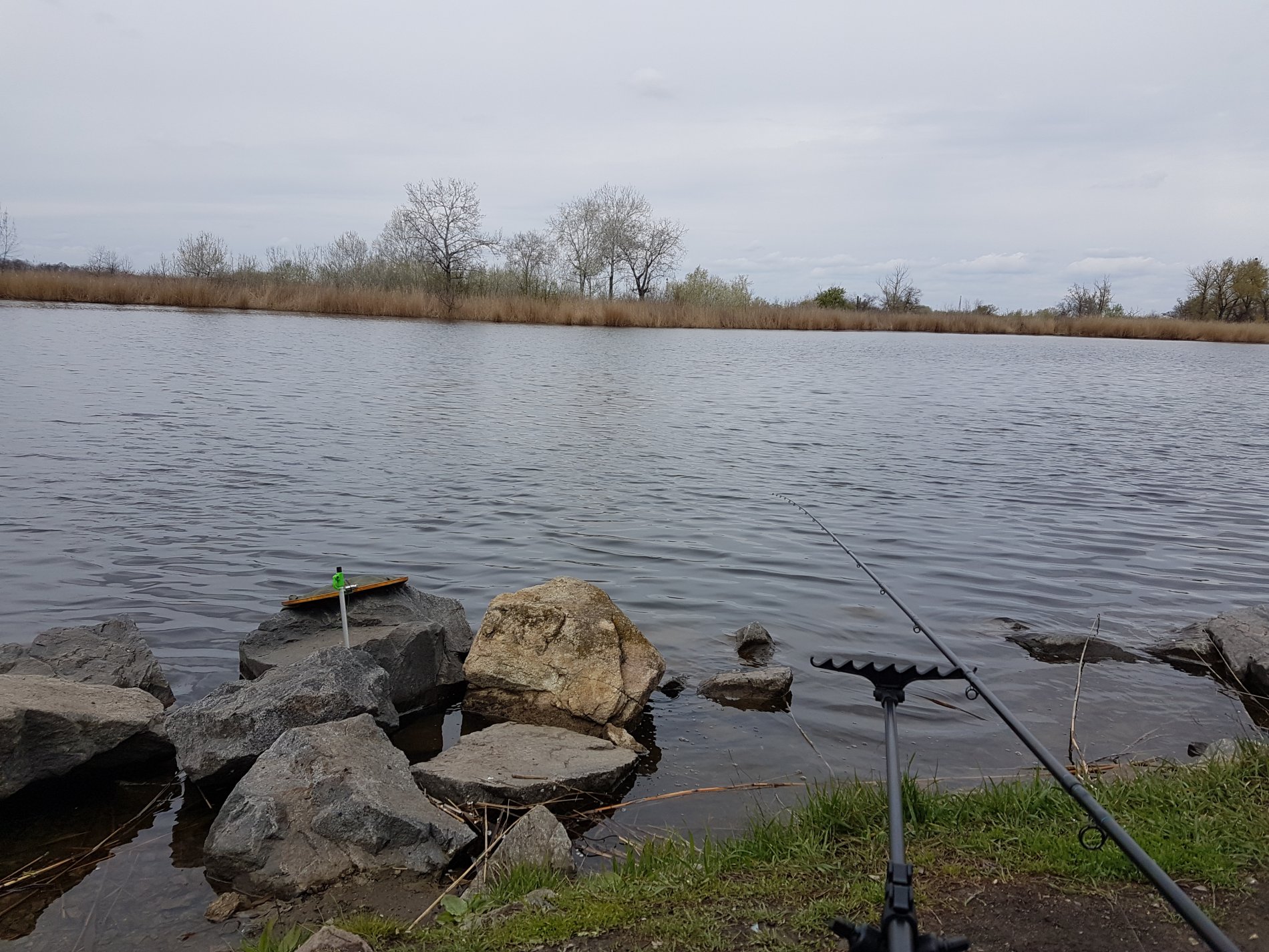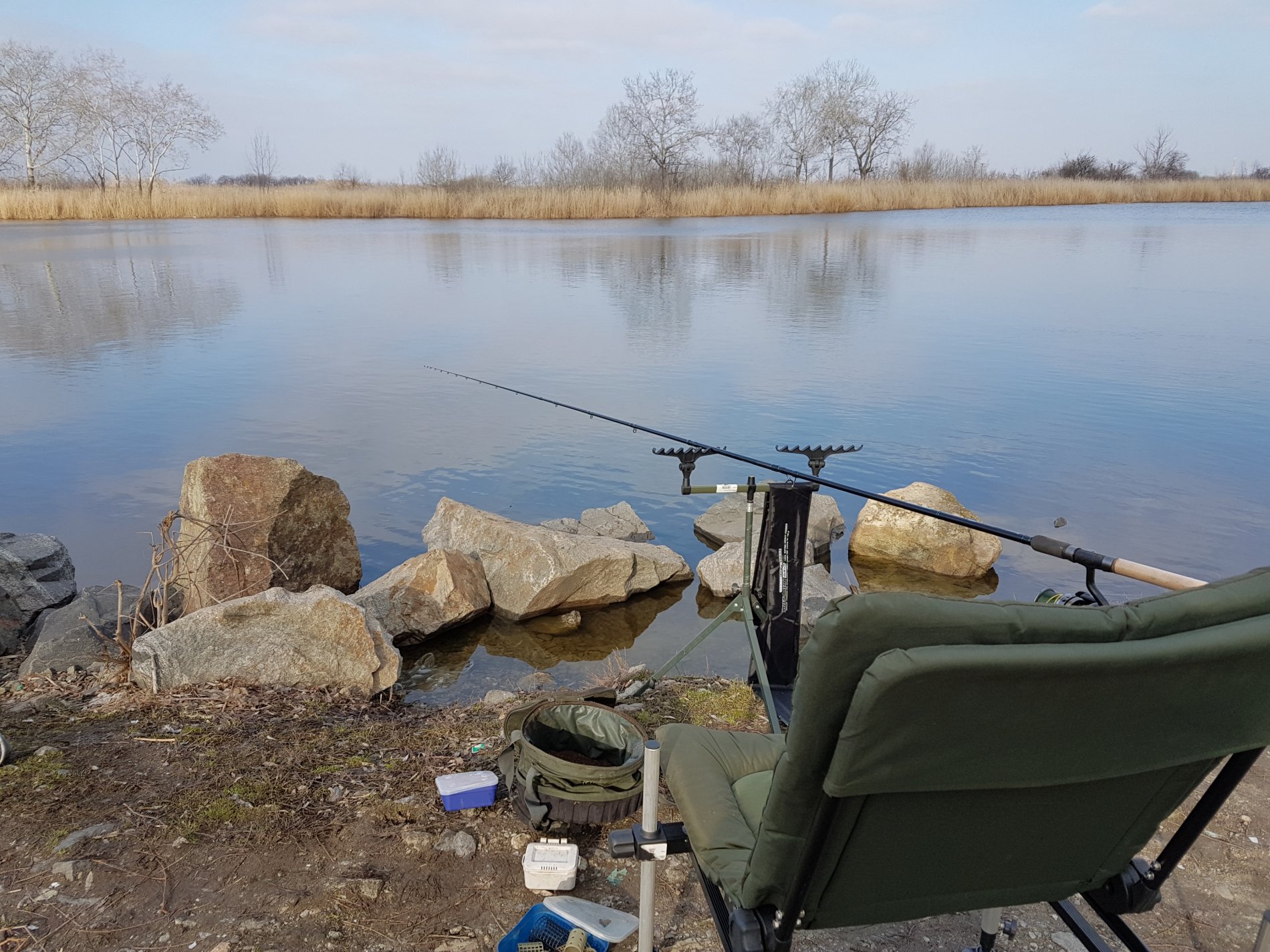 Замешали прикормку, разложились, промерил дно, заклипсовался на 44 оборотах катушки, на ракушнике.