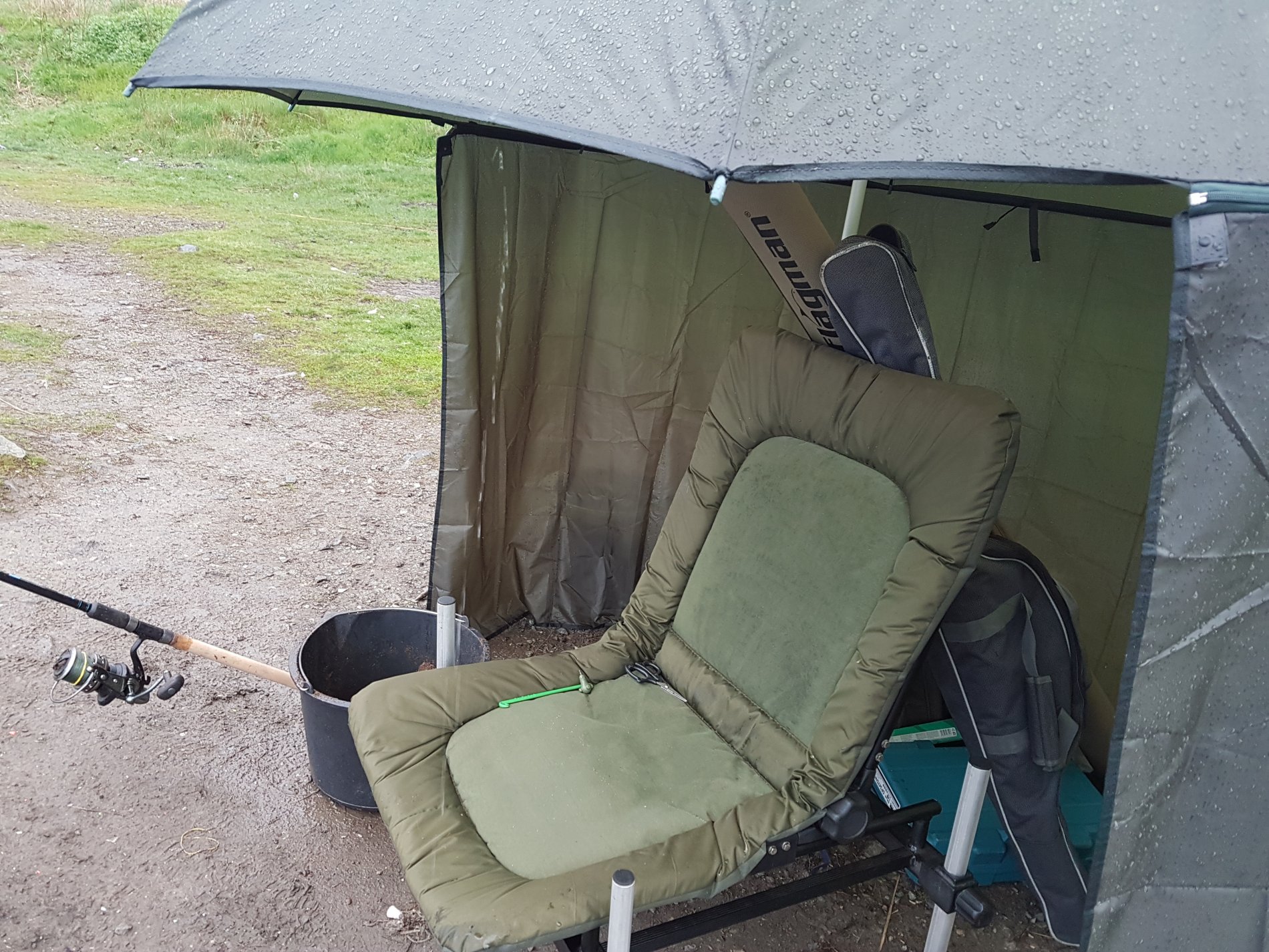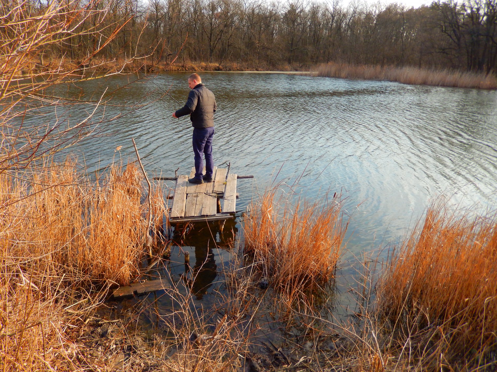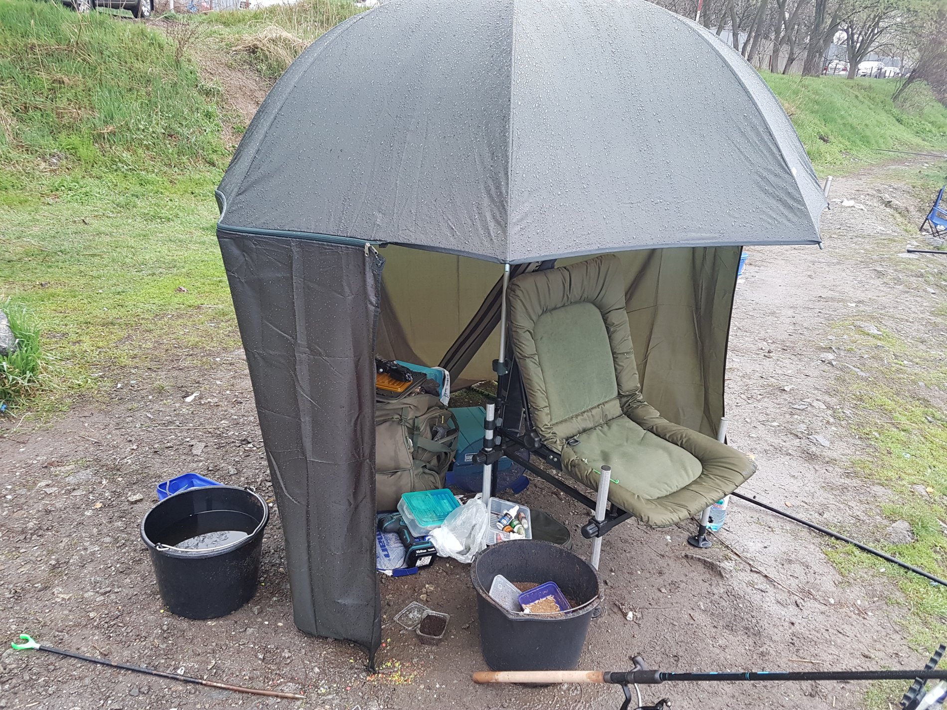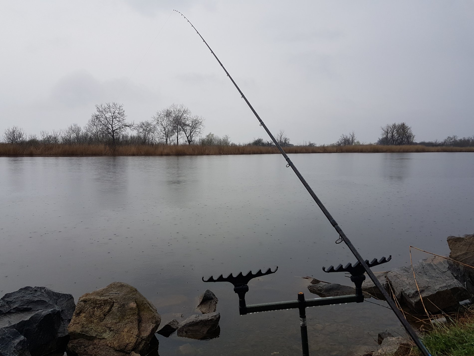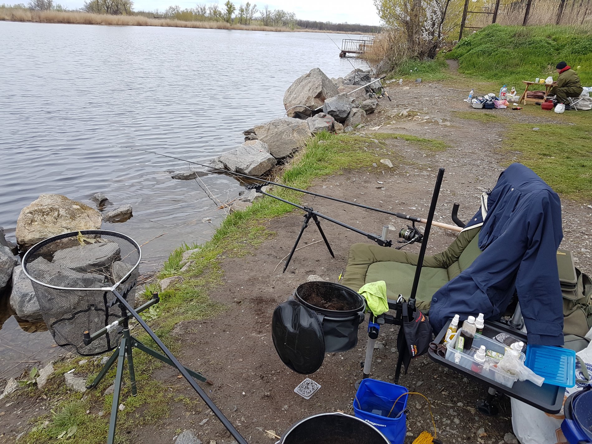 Думали в такую погоду будем одни, не успели занять места и перенести все вещи! Как приезжают две машины, 4 чела дубинщиков. Становятся рядом и раскладываются, у каждого по 2-3 дубины с убийцами карася и пружинами. Через час другой еще подтягивается народ и все места заняты.