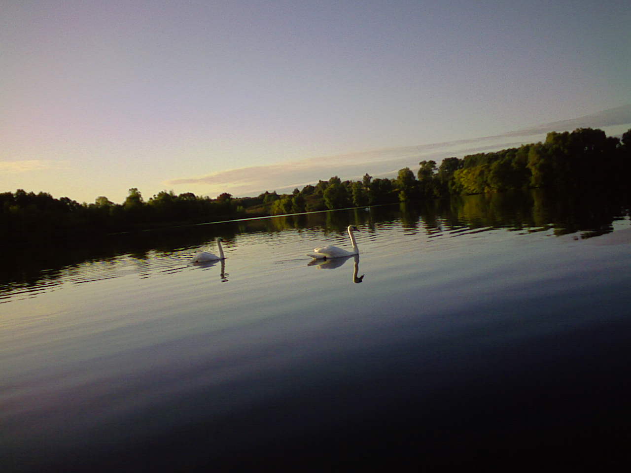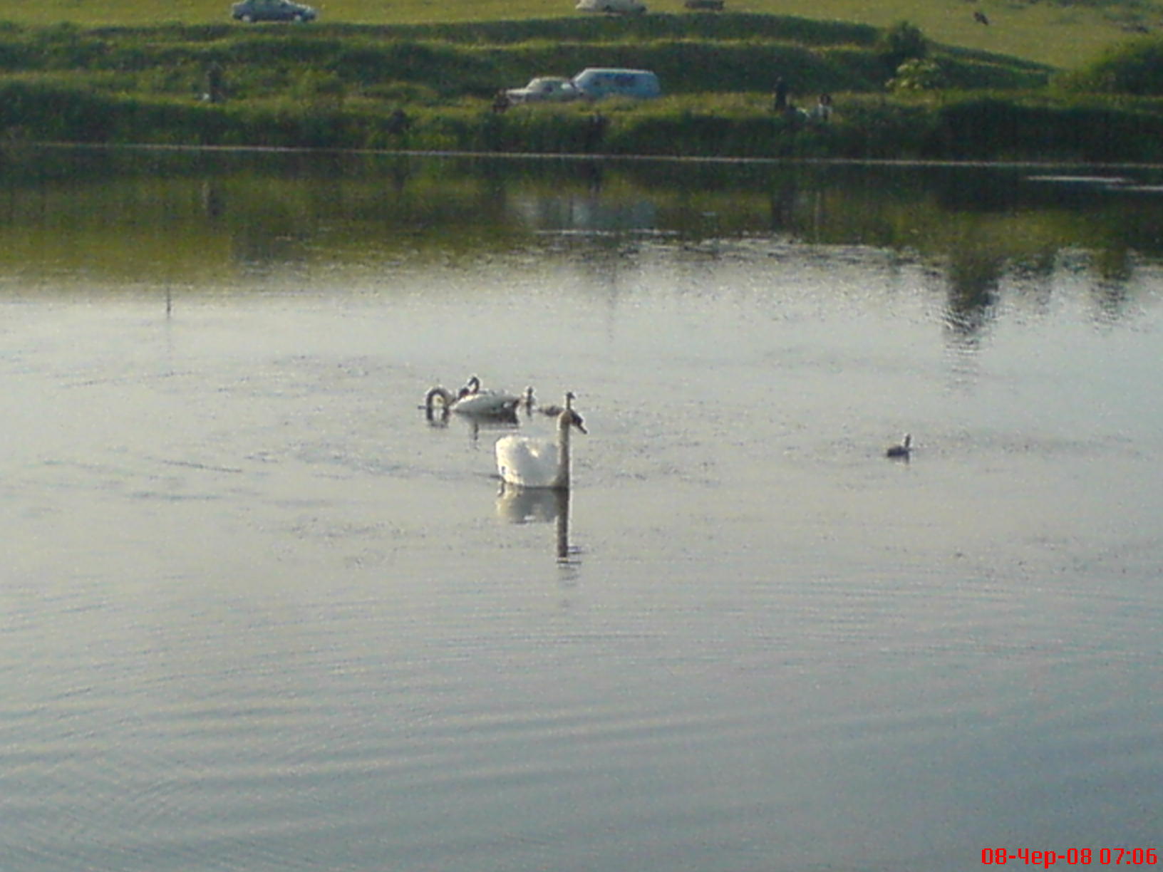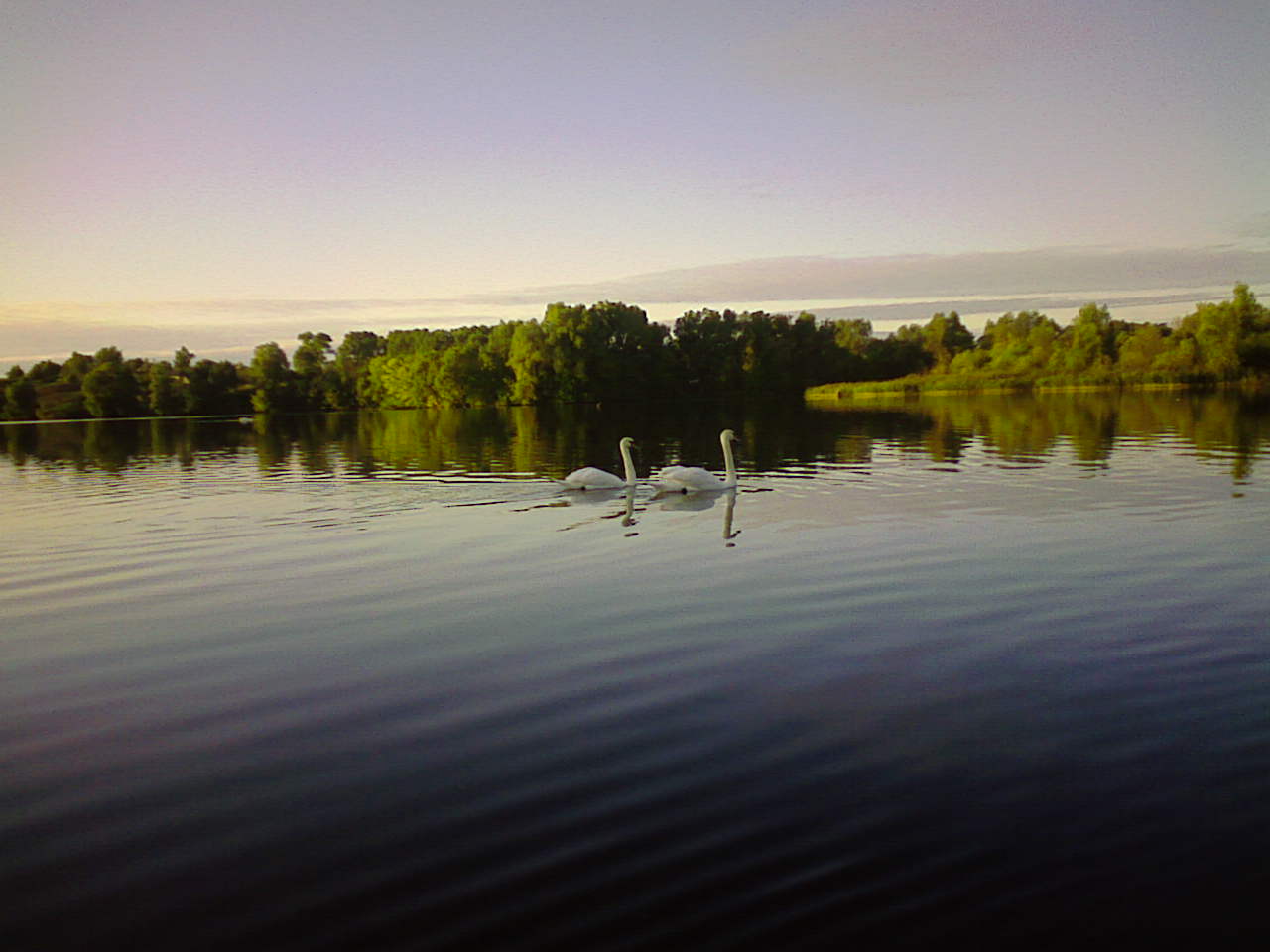 Лебеди Сегодня утром на рыбалке, около 7 час. Снимал на телефон, извиняюсь за качество, все забываю взять фотик с собой. Лебеди подпускали к себе на расстояние около 7 метров. Прилетели на озеро под чти вместе сом ной.