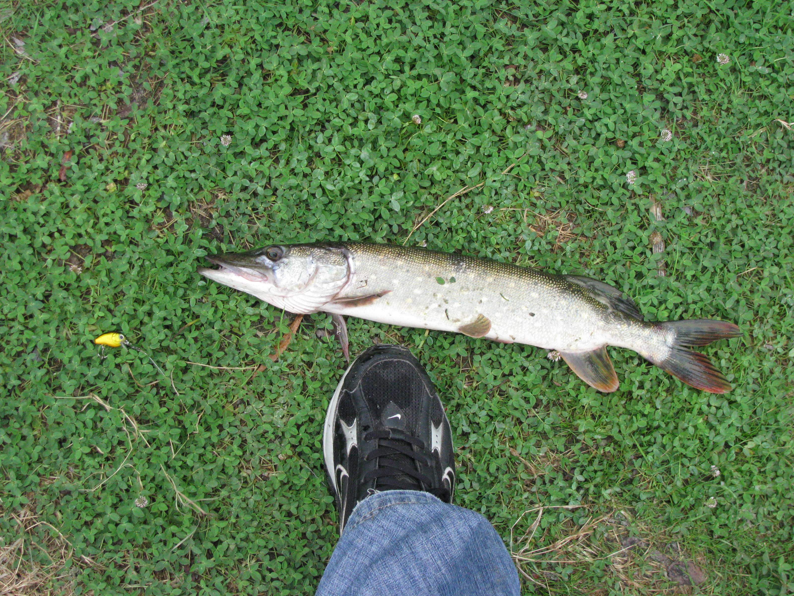 После таких событий решил перестроиться на ловлю щуки. Походил по магазинам Миргорода и Полтавы в поисках потерянной приманки, но так и не нашел. Хорошо, что у меня был еще один такой воблер цвета "золото". Купил тонких металлических поводков в расчете на ловлю как щуки, так и окуня. Имея несколько воблеров minnow и shad средних размеров, сделал упор на них и за два дня добился аж одну поклевку. Даже прославленный chubby упорно молчал. Вернувшись к маленьким окуневым воблерам и вертушкам, дела пошли веселее стали попадаться небольшие щучки и окуньки. Почти каждый день я приходил на старое место в надежде поймать сошедшую щуку и возможно вернуть свой уловистый воблер. И вот через неделю выдалось пасмурное воскресенье, моросил дождик. Понимая перспективность рыбалки в такую погоду даже днем, решил попробовать счастья после завтрака и поймать именно ту щуку. Пока собирал спиннинг на берегу, увидел как один из двух проплывающих на лодке работников со станции проката лодок со словами "смотри дохлая" откинул веслом в сторону, плавающую на поверхности среди кувшинок щуку. "Уж не моя ли это" – подумал я и прицепив воблер BABY PRO 25 от Strike Pro (цвет "золото") начал облавливать знакомое место. В течение получаса не было ни одной поклевки и, машинально делая забросы, я стал задумываться на отвлеченные темы. Но вдруг ход моих мыслей прервала сильная потяжка, делаю широченную подсечку своим ультролайтовым спиннингом (полупараболик) и начинаю подтягивать. Через несколько оборотов катушки, в метрах четырех от берега, на поверхности воды появляется открытая щучья пасть, я останавливаюсь в ожидании броска, но щука стоит как парализованная. Начинаю медленно подтягивать ее спиннингом и, не встречая сопротивления, вытаскиваю на берег, просто отходя назад. Странное поведение щуки стало понятным спустя несколько минут, когда я раскрыл зевником ее пасть. Миниатюрный тройник окуневого воблера впился щуке в жабру и двадцатисантиметровый металлический поводок лишь чуть выглядывал из пасти. Отцепив воблер и сделав несколько фотографий, аккуратно опустил щуку в воду возле берега в надежде, что щука оклемается и уплывет, но и через пять минут рыба оставалась на месте, лишь судорожно дергая жабрами. Решив забрать щуку с собой и подарить кому-нибудь из служащих санатория, посадил щуку на кукан. Пока собирал вещи снова увидел, проплывающих мимо "прокатчиков" лодок и, вспомнив о мертвой щуке в которой мог быть мой потерянный воблер, предложил им обмен: дохлую на живую. Ребята согласились и привезли на берег мертвую щуку, но, к моему сожалению, ее пасть оказалась пустой.