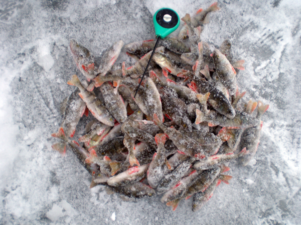 01.03 провів на озері з 10.00 до 15.00. погодка - сонячно, легкій морозець, доволі неприємний вітер, лід крепий 10-15 см, але зверху тонка, потріскуюча корочка, напередоні, як відомо, була відлига. окунь брав слабенько, треба було постійно шукати, 1-2 з лунки і далі. одного пацанчіка зустрів, кажє з самого ранку взяв з однієї лунки 40 штук, а потім обрізало. окунь двух типів: дрібний і дуже дрібний. але на уху - отлично, відварюєшть на бульон прямо з луской, бажано в марлі потім в сторону і далі по рецепту - супер.