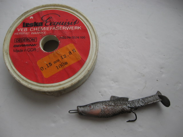 Разбирал на даче барахло всякое не нужное, наткнулся на старенькую сумку. А в ней всего понемногу, большая часть ненужные детальки от блесен, ржавые вертлюжки, кольца. Заслуживает внимания леска, помнится делали простые удочки. И резиновая рыбка, тогда не было еще силикона(1989-1990), помню покупал на пробу пять штук, на озере отлично клевала щука, чудом одна рыбка уцелела.