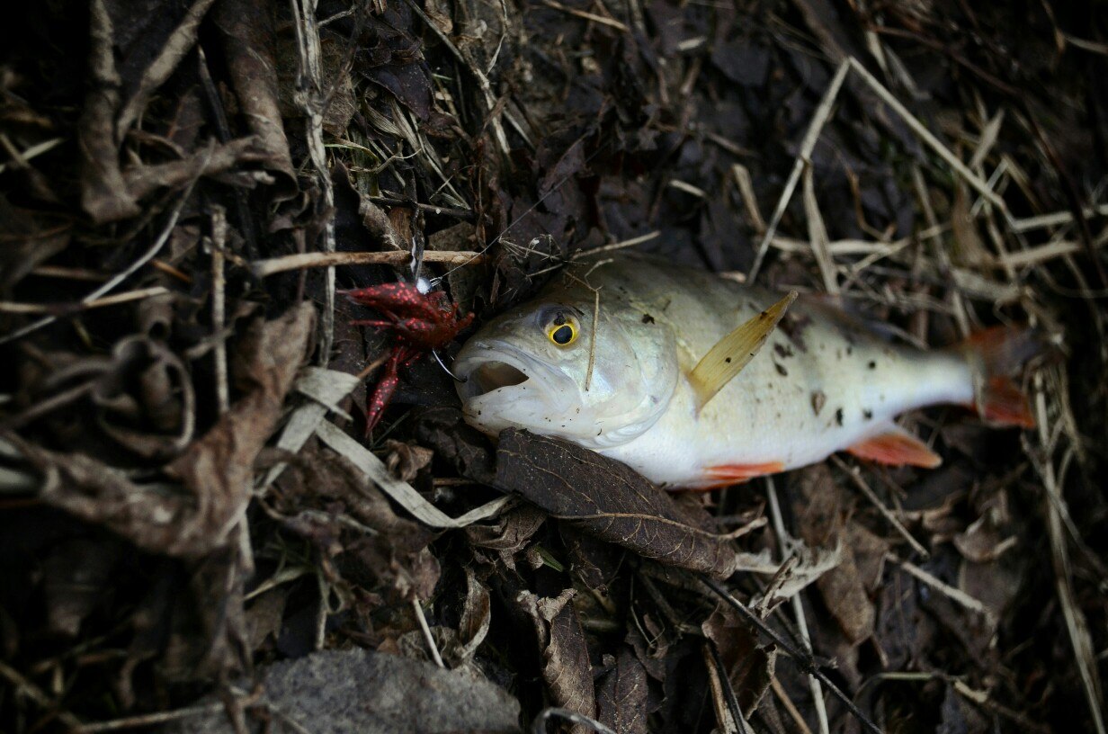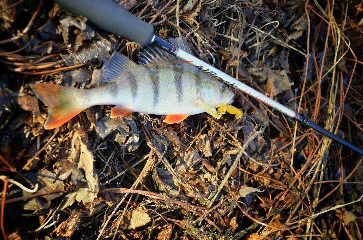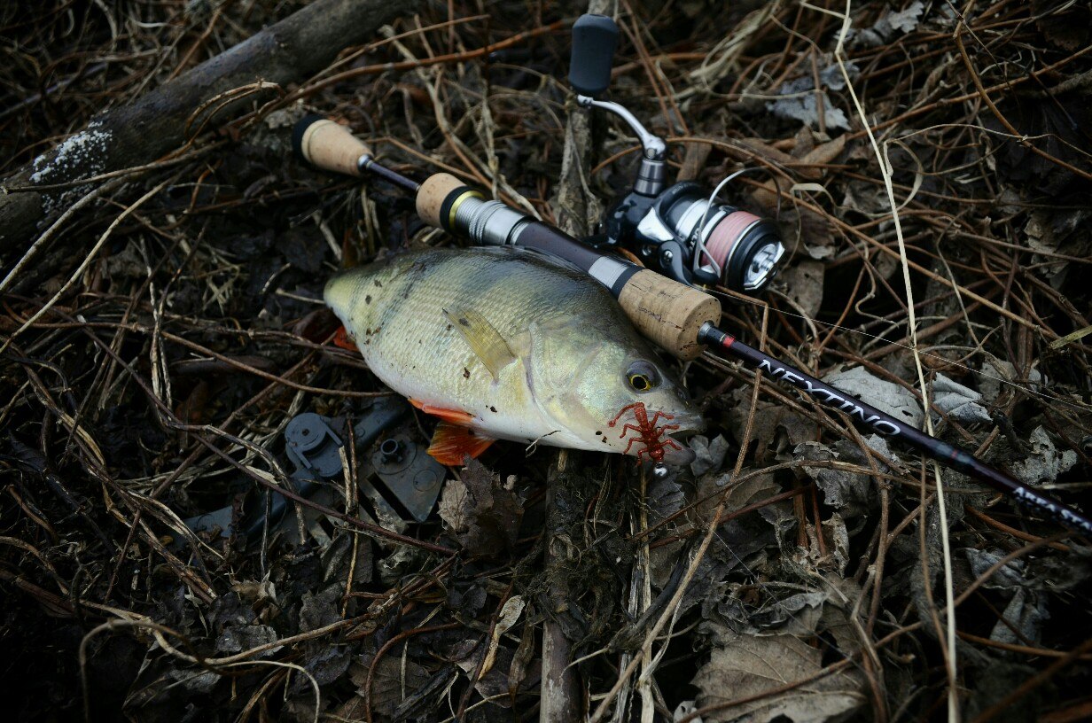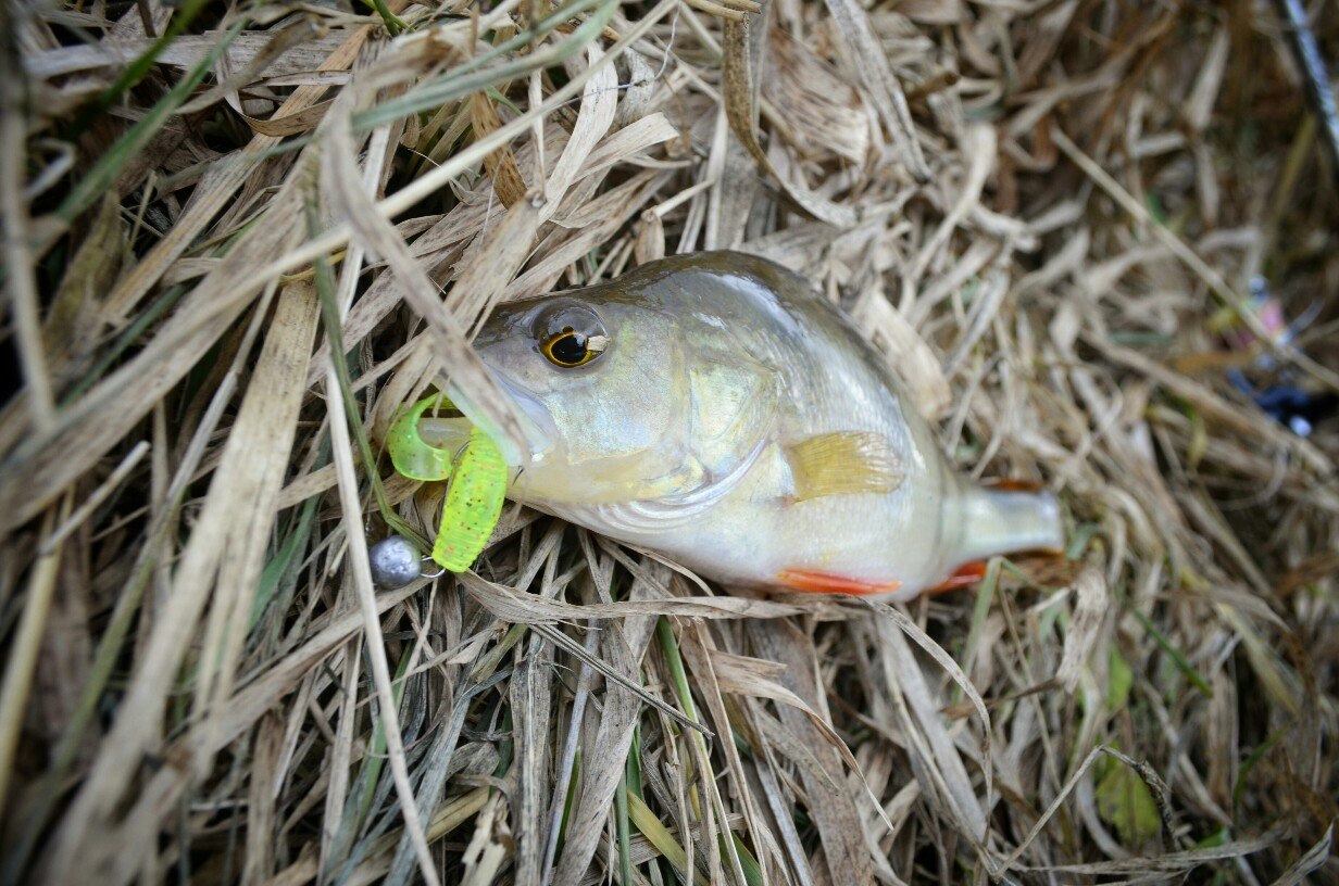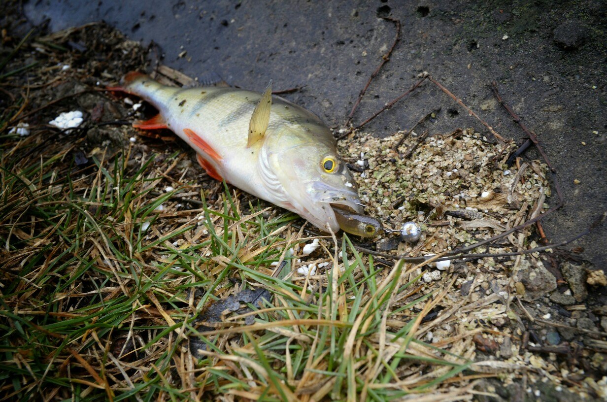 Первые 40 минут полная тишина. Потихоньку перебираю приманку за приманкой, но результата нет! Уж успел расстроится. Но на очередной проводке, чувствую ТУК! Короткая подсечка и есть небольшой окушок уже перед объективом. Дальше все пошло немного лучше))) Окуня клевали не часто но регулярно, без зубастиков не обошлось, вперемешку с окунями было три небольшие щучки )) И под завершение ловли, за все упорство и труд получаю мощную поклевку, подсечка и палочка приятно изгибается в паре с песней фрикциона. Две минуты борьбы и бонусная мамаша перед объективом. На этой приятной ноте заканчиваю ловлю.