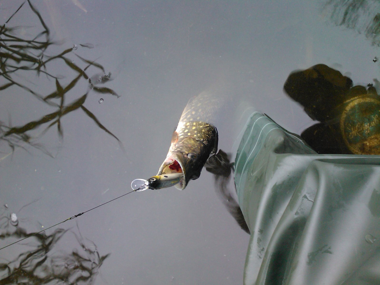 Облачился в заброды - и айда яечка студить! )) С четвёртого заброса заработал поклёвку. Небольшой щупачок, но зачепился нормально, аж за кадык. За что и получил множественные тяжкие телесные, не совместимые с жизнью, к сожалению. ((( Ещё пару забросов - и клюёт Шшшука, размером с пол-тора воблера! )))) Этой повезло, была амнистирована. И... ВСЁ. Ходил, бродил, кидал... Не знаю, упирался в воблера, может надо было на джиг перейти... Но мне джиг как-то не очень. Тем более, в почти стоячей воде и мягком дне с водорослями.