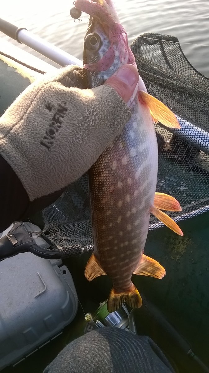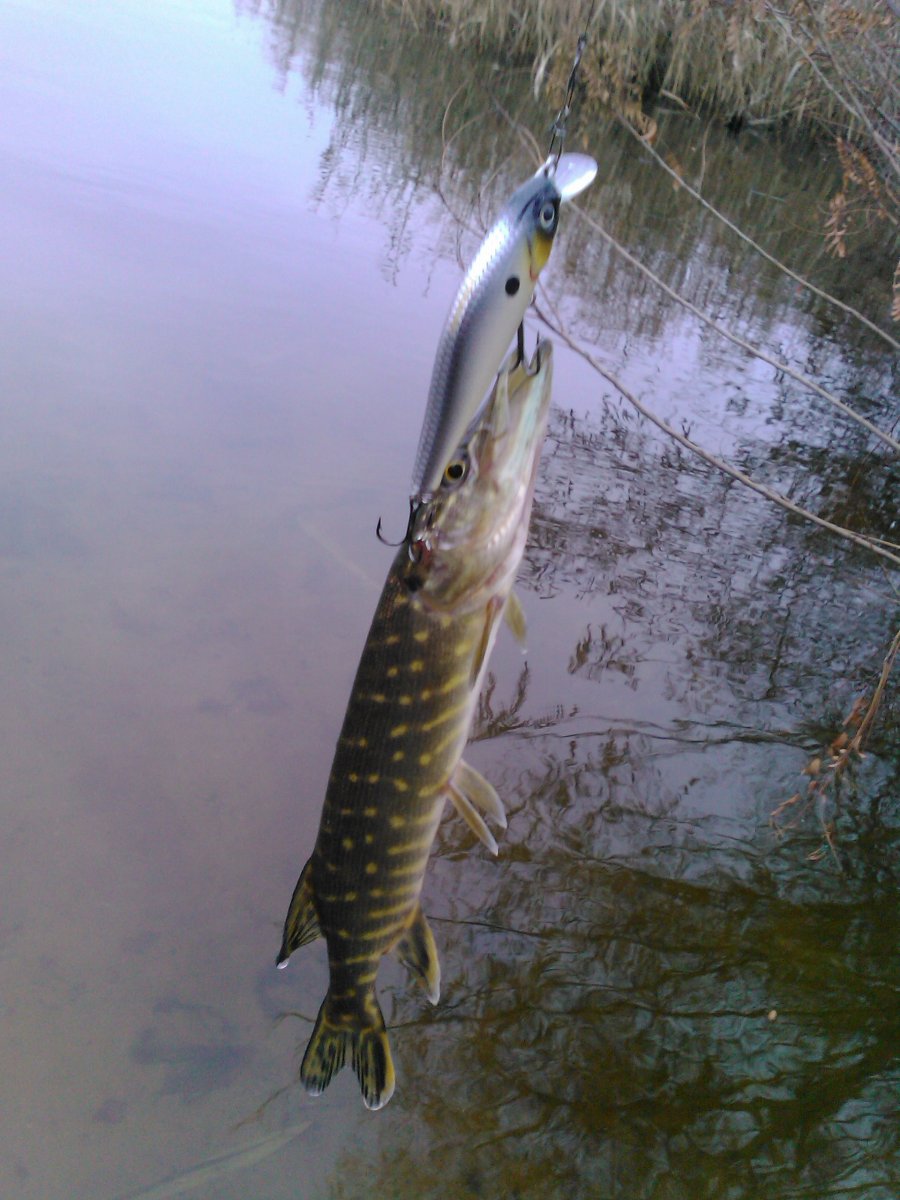 Ходили по многим точкам и с утра поймали лишь одного мелкого щупачка:(, но в 14-00 на мелководье нашли таки щуку. Правда размер не радовал, но поклевки злые и пару зачетных щук напарник мой взял:ага:.