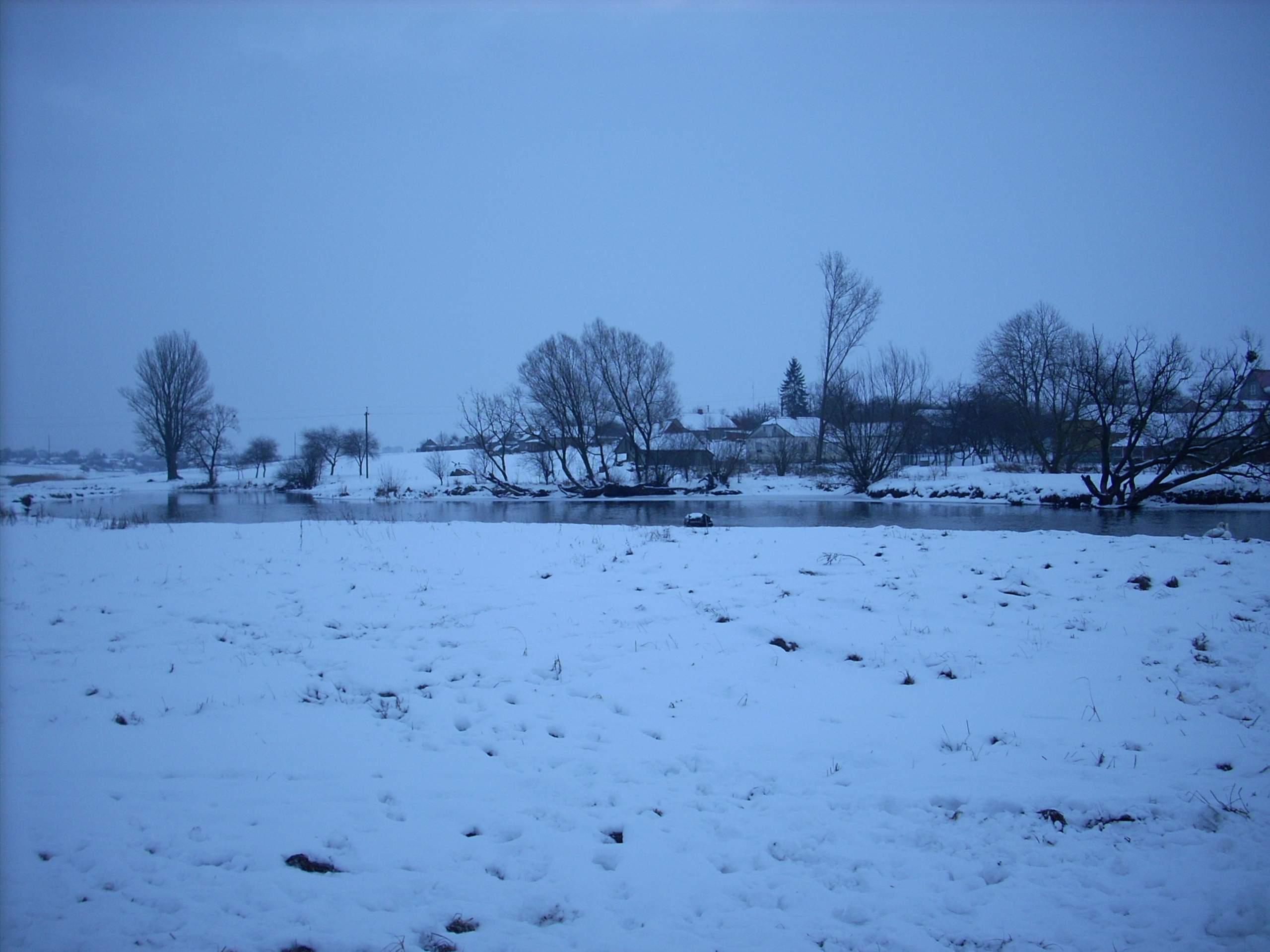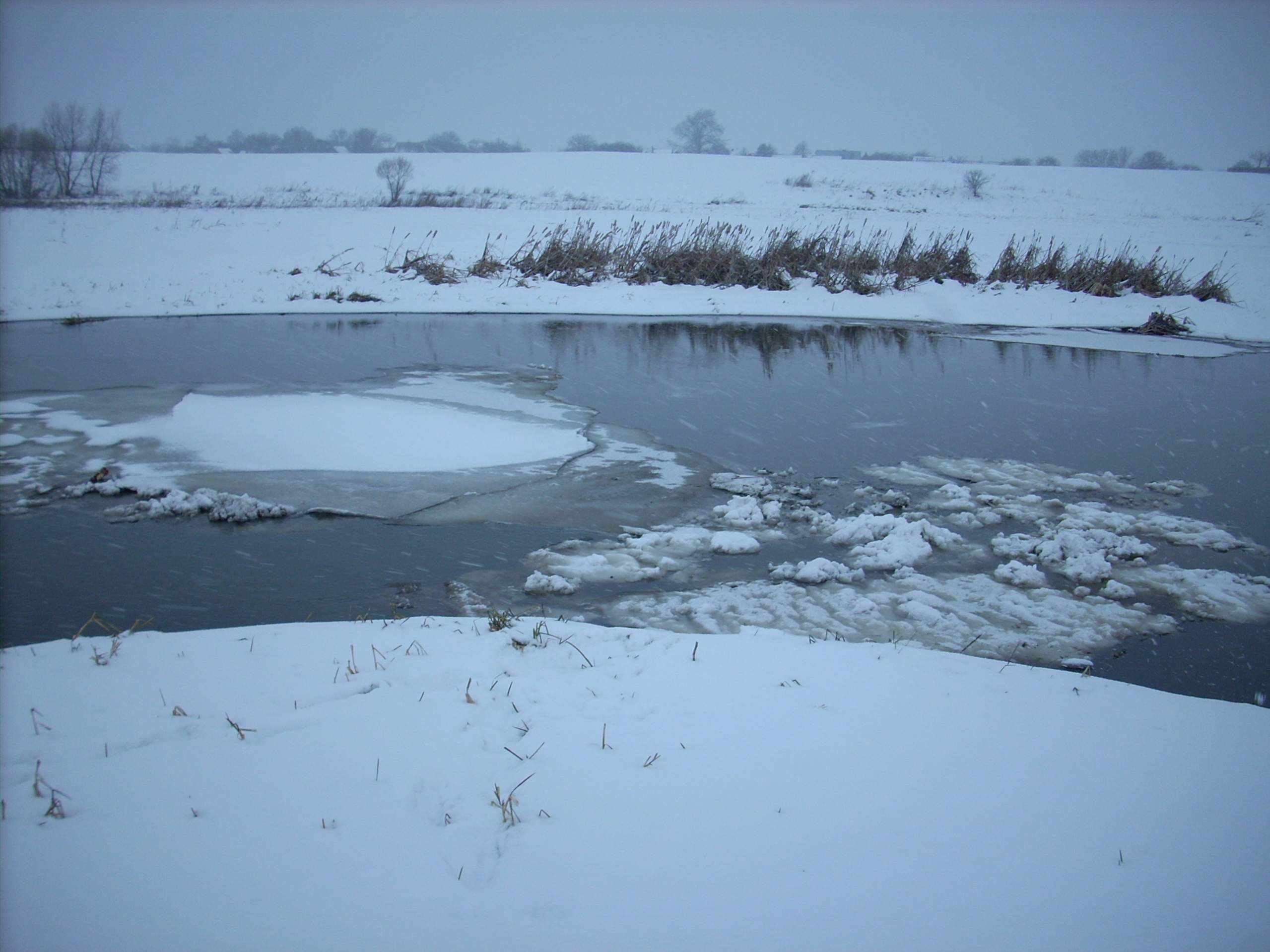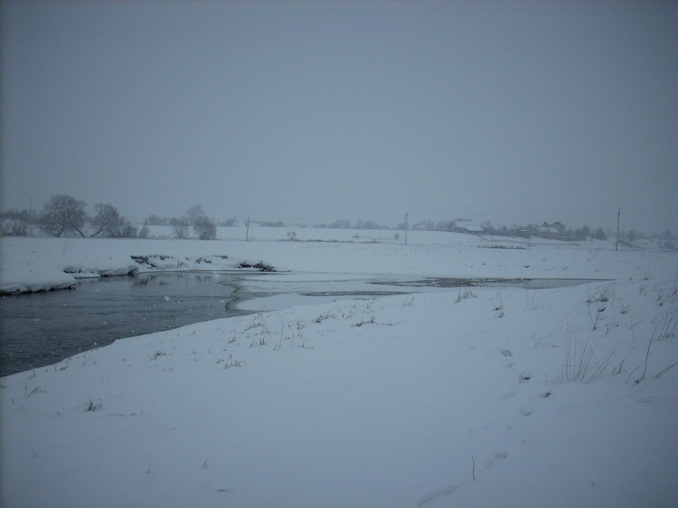 Вийшов на річку зранку в 7.15. В 7.30 південний вітерець змінився на західний, у повітрі з`явилися перші сніжинки (я якраз збирав спінінг), а коли почав ловити то сипало вже конкретно. Ходити важко, місцями снігу по коліно. В одному місці провалився в заметену снігом боброву яму, треба бути обережним. На річці є вже закраїни під берегом, вода несе лід, а місцями утворилися льодяні затори. Луга встає – на радість любителям зимової рибалки; ну а спінінговий сезон напевно закривається.