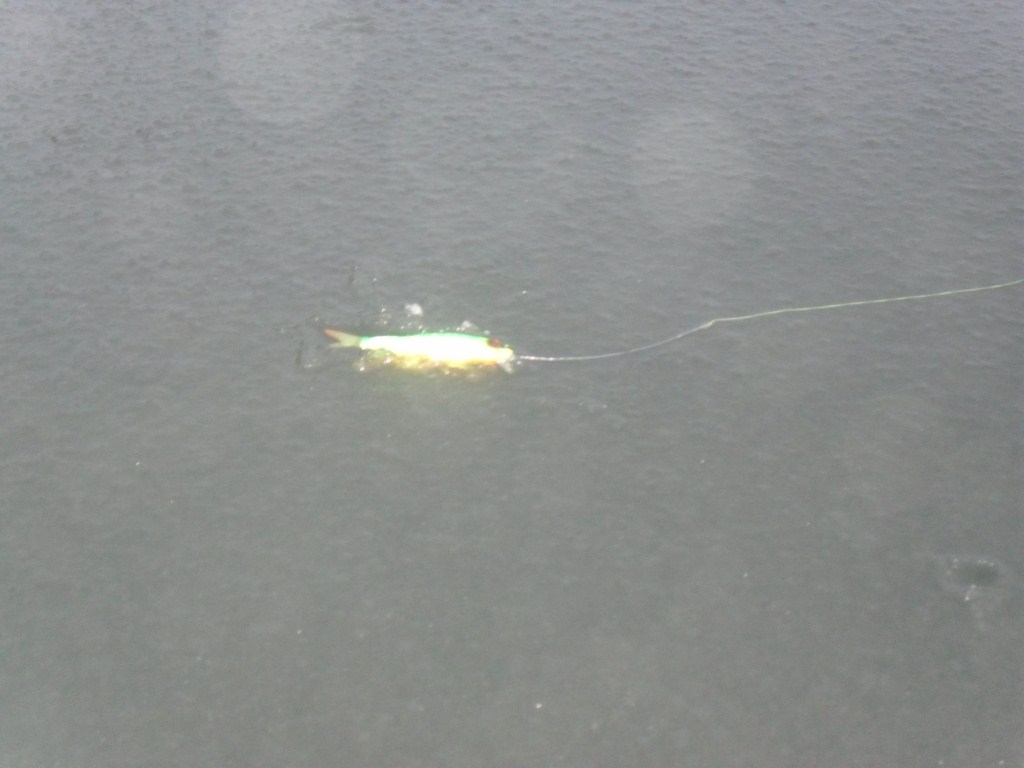 Ловити вирішив на чорно-біле Копито №1 з офсетником на 5г чебурашці. Сніг в очі і вітер утруднювали контроль проводки, покльовку відчув якось інтуїтивно. Тиц, тиц, і я вимотую обривок флюра. Щучка ріже його на ура. Я і раніше про це знав, але розумію що при поганому кльові флюрик допомагає, і хочеться окунька зловити. В таких випадках шкода не приманку, а рибу яка мучається з таким пірсингом. Але приємно що річка жива, хоч електрики стараються. Поставив таке ж Копито лимонно-кислотного кольору. На тій ямі яка принесла єдину щучку на фесті Луга-2, відчув чіткий тик на паузі, але не реалізував.