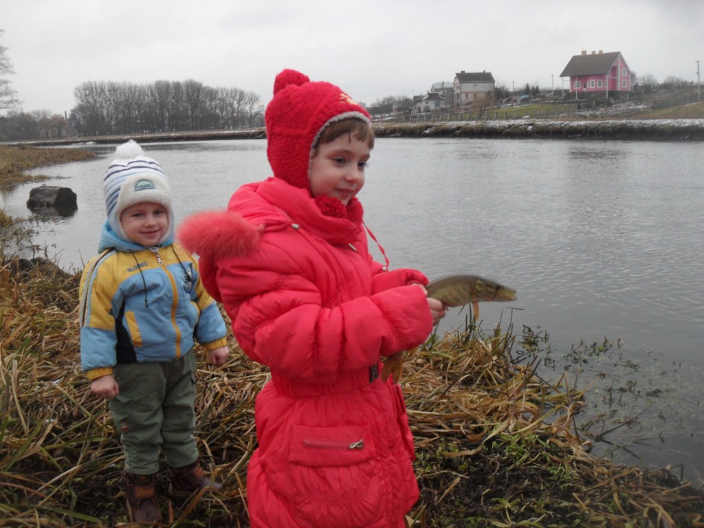Сьогодні нажаль попасти на фест також не вийшло, ( хоч на юшку все таки потрапив, юшка була смачна :)), так як треба було завести жінку в Любомль, поки жінка вирішувала свої справи, я рвонув на місцеву баюру, вона майже вся була вкрита кригою, але з краю була ділянка де лише був невеличкий шум від снігу, я поставив Тіні Мегалона, і видурив невеличку щучку, випустити я її вирішив в Лугу, так як там її всеодно браки затовчуть :( Випускати поїхав з дітьми, діти залишились задоволені, я теж, так як щучка довгий час була в пакеті і вижила.