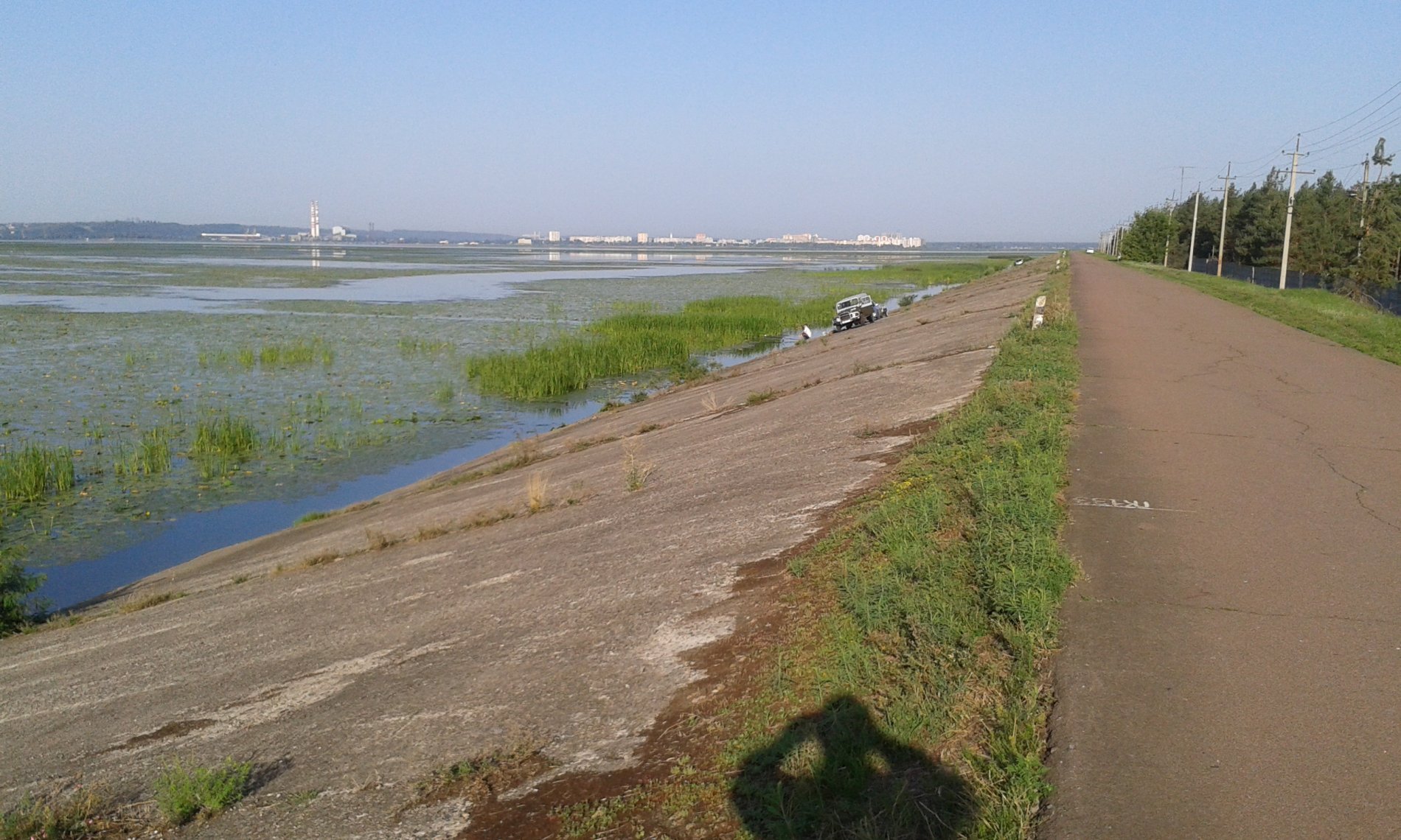 Из за сумасшедшей жары пусто. Обычно полно машин. Кто на хищника, кто на леща подальше от берега, кто на карася. Есть места где можно закинуть донки. Бывают на дамбе любители ночной рыбалки на донки. Последняя информация от знакомых это сом на 7 кг. с дамбы. И хороший клев подлещика до 1 кг. но это с лодки и ближе к руслу на ямах, нужен эхолот. Карасик и плотва клюет на удочки с берега дамбы. Минус нет места для пикника, с другой стороны дамбы сплошные заборы дач. Кто с ночевкой, спят в машинах.