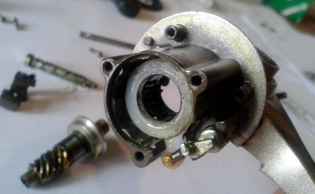 И думаю, вернее уверен, что поступил правильно. Основной механизм, головную пару, бесконечник и все подшипники я и раньше смазывал, да они и после промывки выглядели как новые, вскрыв фрикционный тормоз увидел излишки смазки на муфте, но и это не критически. А вот то, что на втулке которая одевается на концевик и на которой стоит подшипник с муфтой, видны отчетливые следы работы роликового подшипника это не есть хорошо:( Не знаю - или ее изначально там было недостаточно или она куда то делась (на 3000-й мазка была в норме, хотя топил именно ее). Ролики стоят в пластиковой обойме, и естественно при недостаточном количестве смазки они будут разбивать обойму. Далее все просто, помыл детали, смазал густой смазкой трущиеся детали ( поверхность муфты оставил сухой), жидкой смазал подшипники и ву-а-ля, катушка запела! Никаких шумов, бархатный мягкий ход все так как и должно быть. Единственное что я добавил, так это прокладочку (вырезал из коробки от воблера) под наружный подшипник бесконечного винта для уменьшения продольного люфта.