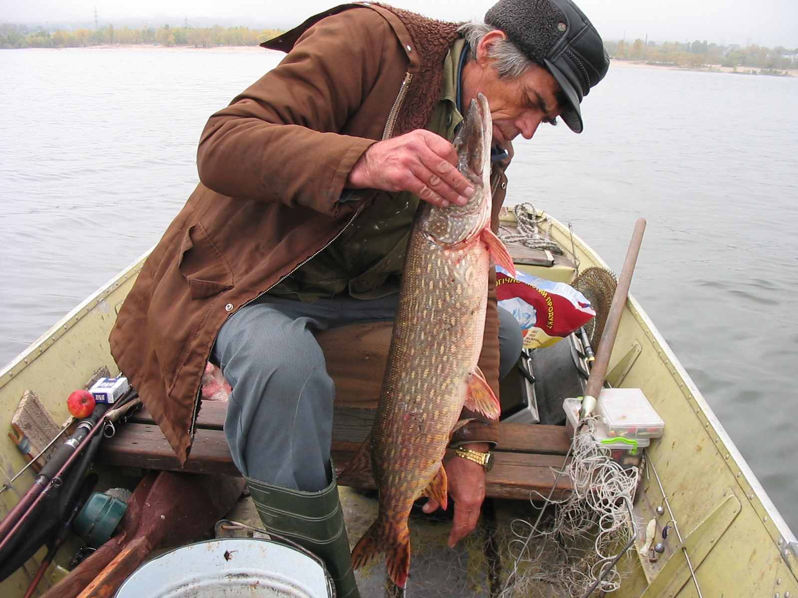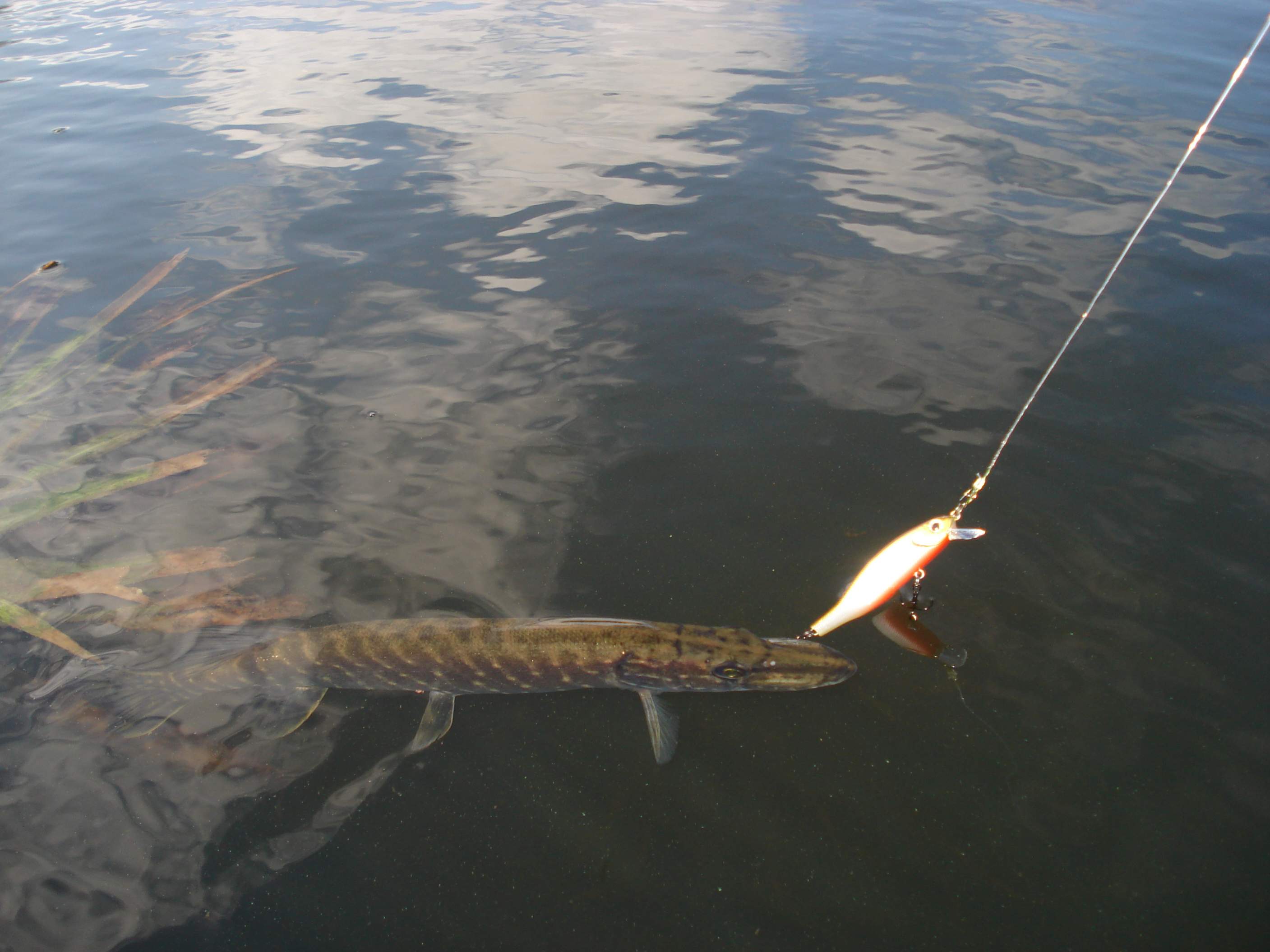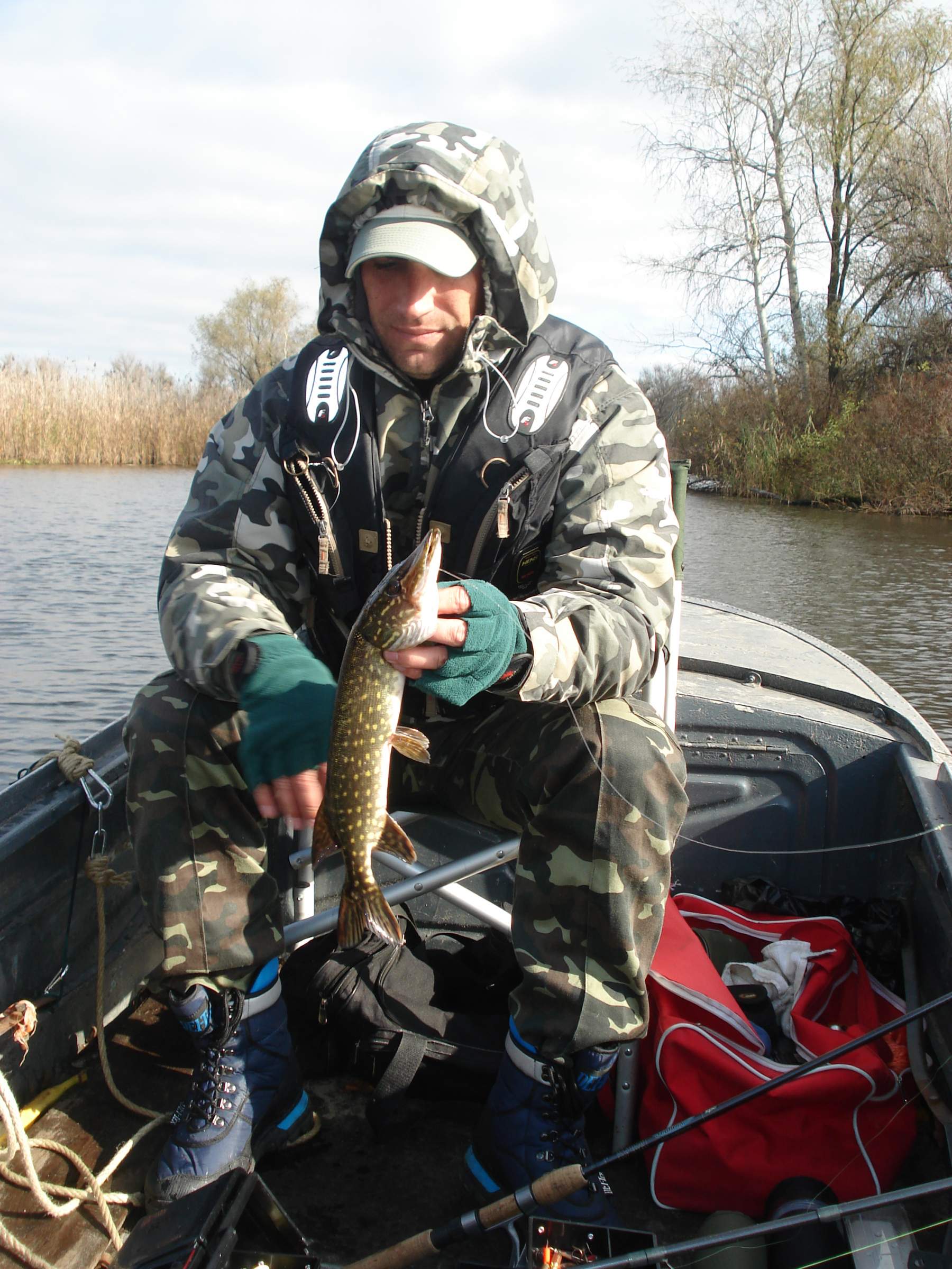 В конце рыбалки на открытой воде мощная поклевка щуки (примерно 3-4-5 килл) довел ее до борта лодки, выложил на гладь воды, но.....досадный сход ((((