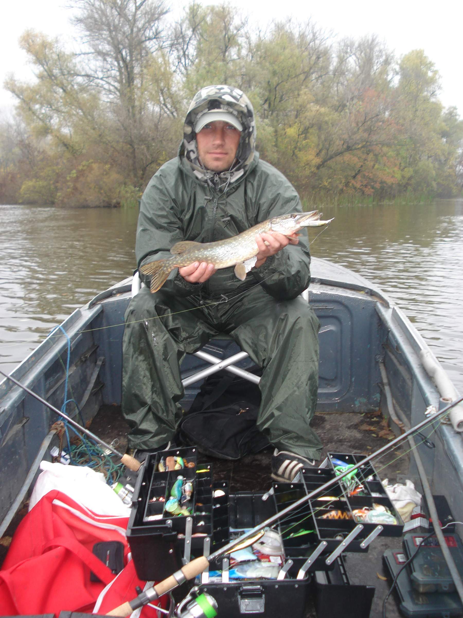 через полчаса нас ветер с волной попросили вежливо удалиться с открытой воды, и мы под сопровождением небольшого дождика искали заливы, где можно потвиччить. (более шести фоток нет возможности выкладывать в сообщении, так шшо, на словах: щуку отыскали и удалось хорошо поработать с воблами) + одного щуря взял на ПОПЕР, что нас удивило, так как , температура воды уже ниже 10 градусов.