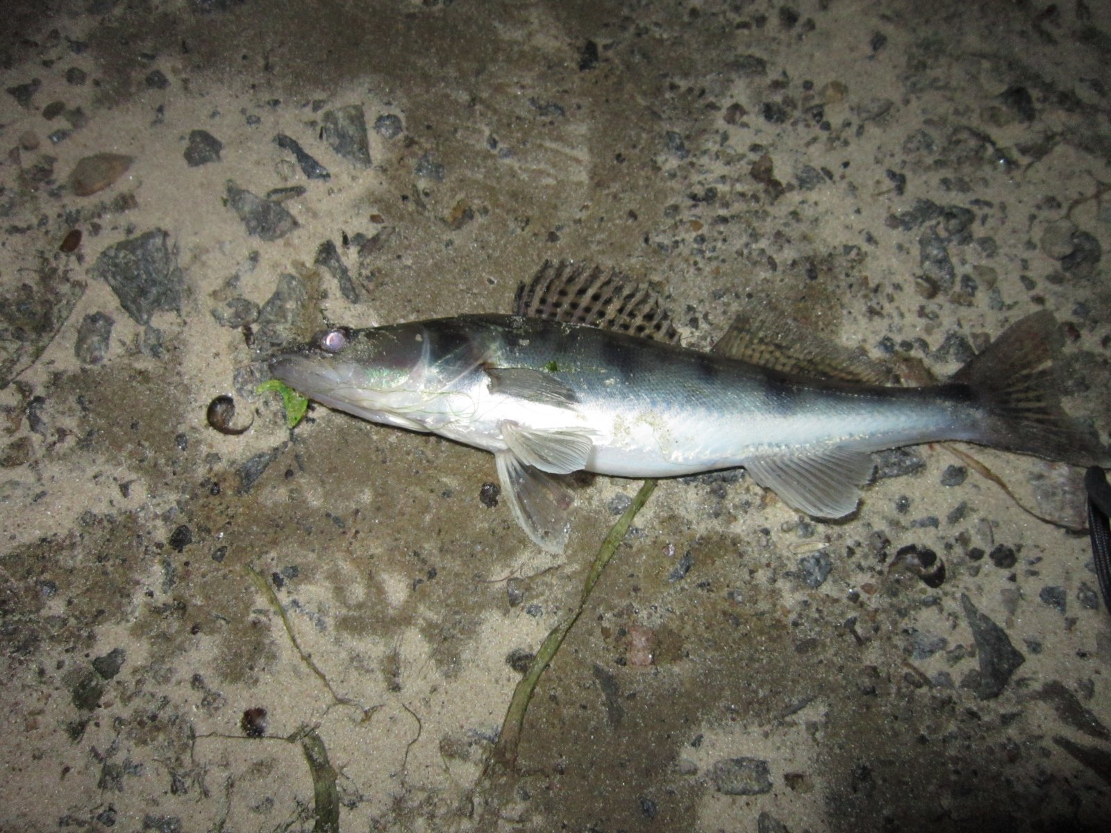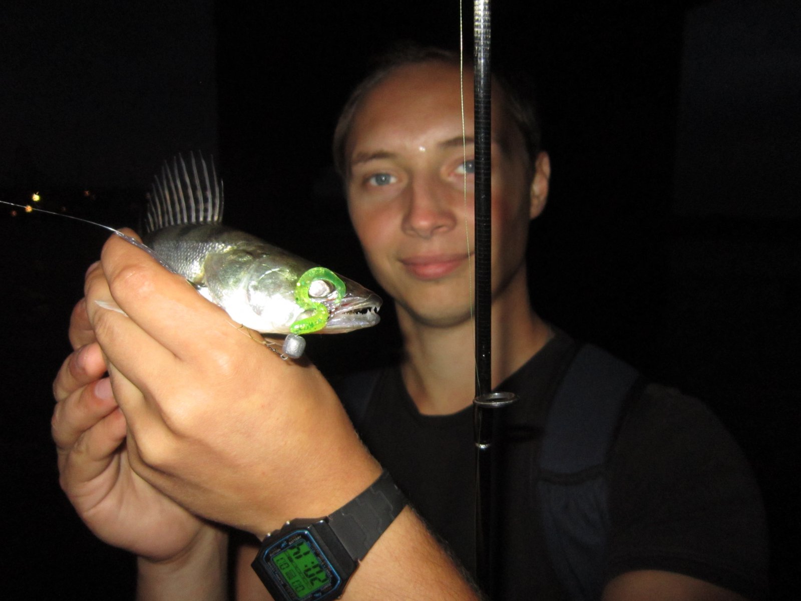Сразу по темноте изловил судачка на воблер. В 23.00 напоследних забросах, почти подряд два схода у самых ног мелких судачат.