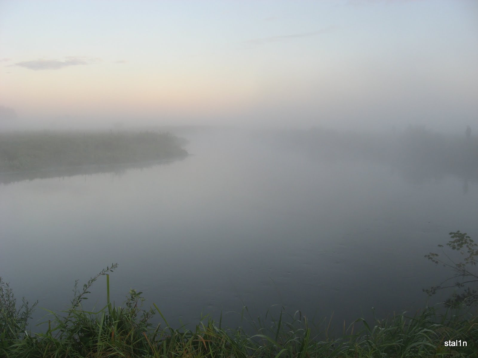 З ранечку йду на річку, по лугу всетлився туман, над водою він дуже густий. Перші закиди і відразу клювання не величкої риби. Ставлю маленьку рибу на донку живцем. Пробую додати кілька опаришів на гачок - нічого не змінюється клює невеличка рибка, пробую ловити на пшеницю - покльовку доводиться чекати довго, але клює риба того ж розміру. Тому повертаюсь до опаришів.