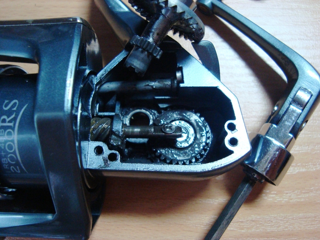 Сразу что увидел, отсутствие боковой крышки. Ну думаю мелочи если что поищу на форумах,но когда глянул детально то увидел обломок механизма на штоке из за которой не ходила шпуля катушки. А так же в ужасном состоянии ролик лесоукладывателя, тем более что там не подшипник а втулка,ну это можно поменять, а вот где найти крышку и сломанный механизм?