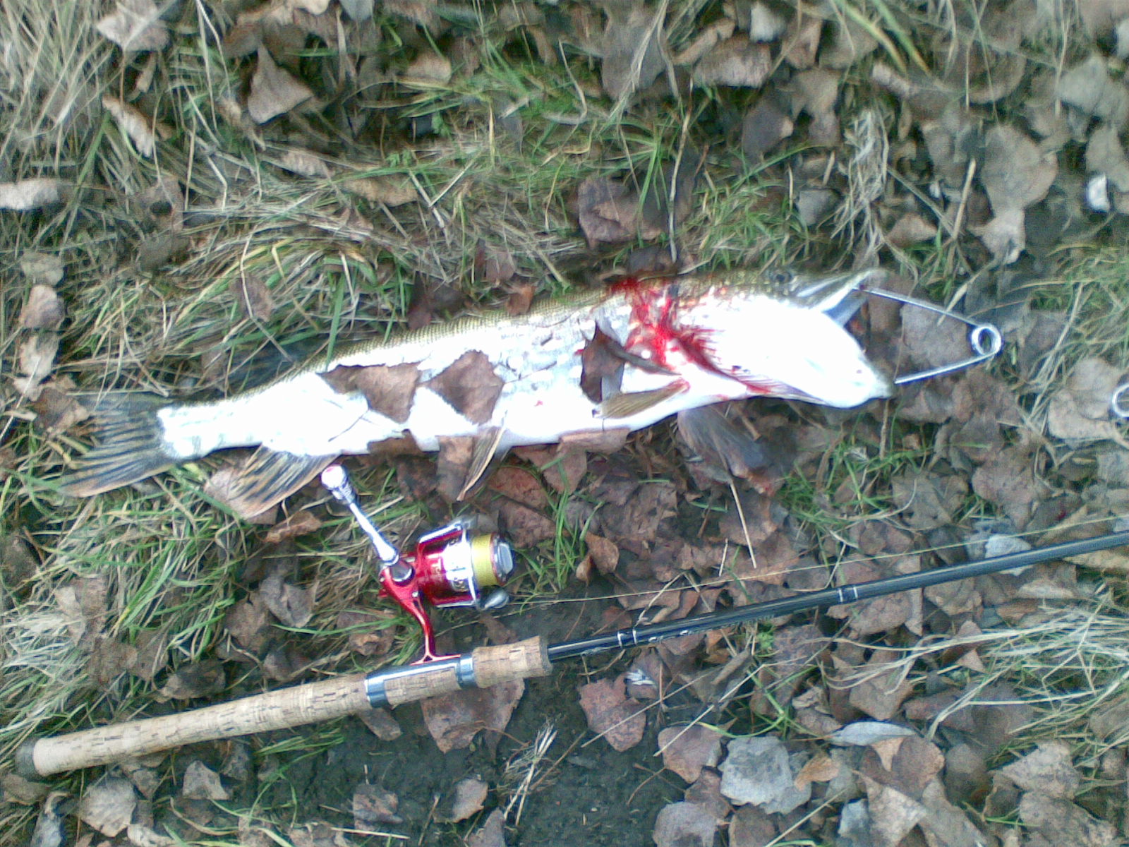 По правому берегу пошёл в верх по течению. Видел усердно ныряющего подводного охотника... (видимо свой кукан он тщательно спрятал...). Облавливая остатки растительности вдоль берега поднимаюсь вверх по течению. На очередных кустиках на первом забросе резкий удар... не ожидал и прозевал... на Slider-е остались следы зубов. 20 минут упорства результата не принесли. Ппрошёлся выше по течению ~1,5 км - тишина. Вернулся на место поклёвки - на Slider тишина, ставляю Rapala Shad Rap... на второй проводке щука 2,2кг. Воблер доставал минут 15-ть, заглотнула по самое не хочу, аккурат по вертлюжок на поводке... (из полёвки). Сфоткал телефоном, сори за качество...