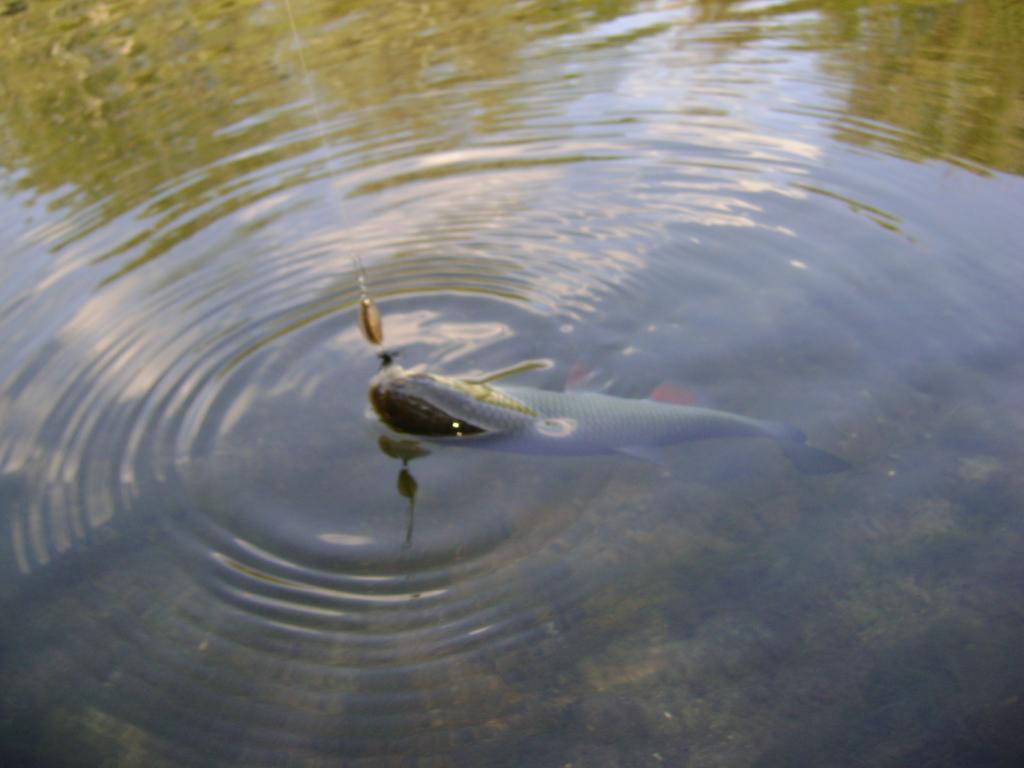 этого места и ничего больше не соблазнив, решаю спускаться ниже и по ходу облавливать места, до обеда поймал около десятка небольших голавлей, напарнику повезло больше поймал одного но с пол кило. После обеда опять знакомство с новыми местами, мне удается поймать несколько небольших голавликов и первого в жизни язя. Вечером в сумерках был у поваленного дерева- взял еще одного язя и заработал пару приличных всплесков явно не голавликов на Уж.стик и вертушку, но увы не реализованы.