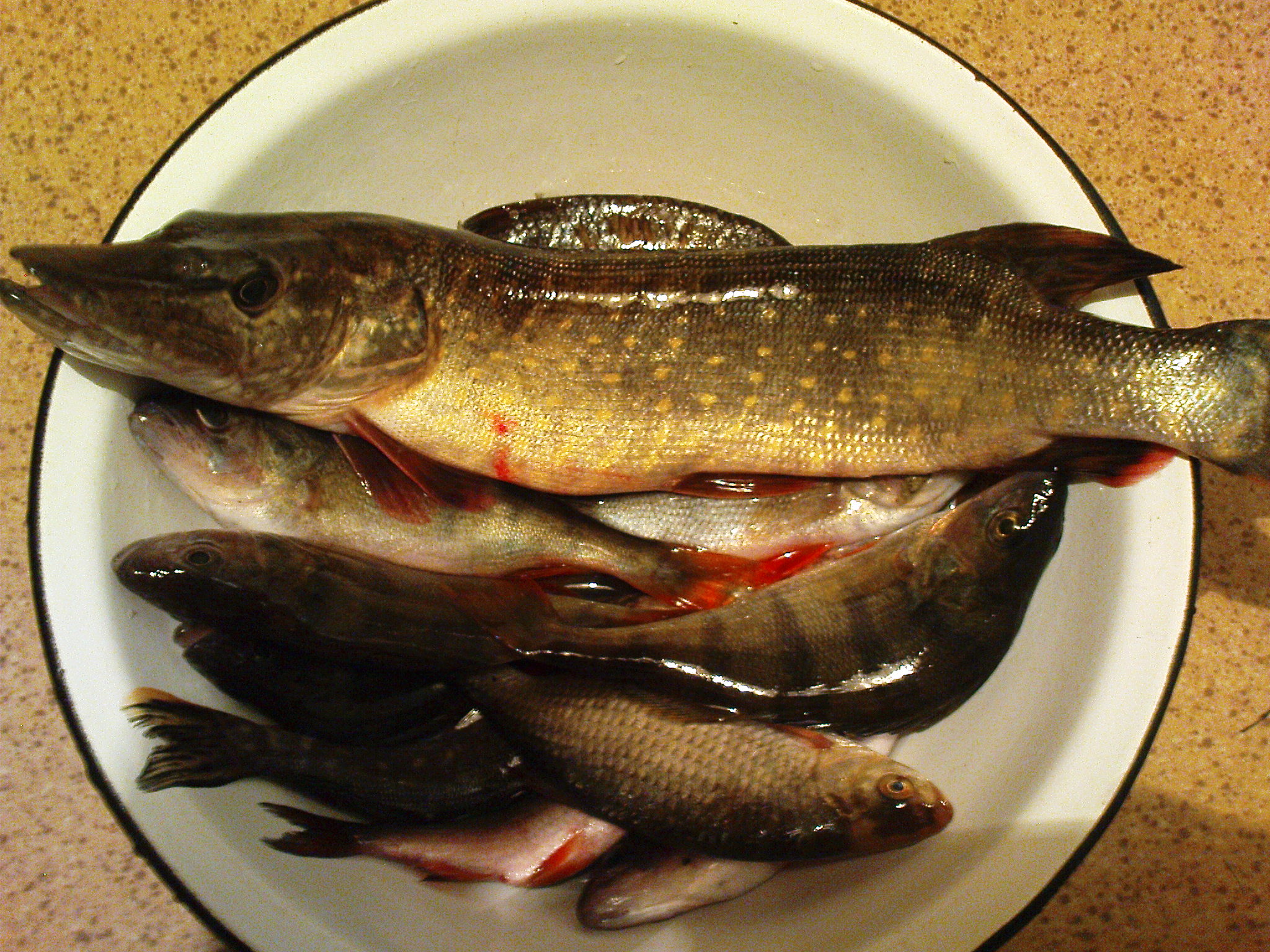 Всем привет.Вчера рыбачел на Псле в районе с.Крамаренки.Выехали с товарищем поохотиться на щучку и окунька.Товарищ на спин со всемивозможными приманками,а я решил применить зимнею удочку и "ЯЙЦА"как потом оказалось очень эфективно.Поплыли на знакомую мне ямку,по пути товарищ розмачивал свои приманки но без результатно.На мелководье даже малька не видно,наверное рыба уже готовится к зиме.Стали на яме,товарищ бросал на меляк и делал проводку в яму,а я с под лодки,как раз обратка крутила именно по яме и почти с ходу три щучки.Одна 1.5кг.и две гр.на 800 и два обрыва лески с хорошей рыбой.Потом брали одни окуня 150-200гр.Товарищ так и не разловился,предлагал перейти ему на мою снасть но не захотел,он испытывал свои приманки.Кстате по его прозьбе сделал ему отбойник просмотрев предварительно материалы и сделав на свое усмотрение,получился 100%-ый рабочий вариант. Отбивал блесна и воблеры с первого удавра,благодоря ему не было потерено ниодной приманки,так как ямка была закоряженая.Под вечер сплавали еще в залив,я половил немного на летнию удочку красноперку,а товарищ дальше упорствовал на спин но так ничего и не получилось.На фото снасти и половина улова,второй половиной чесно поделился с товарищем.Интересная рыбалка получилась!!!