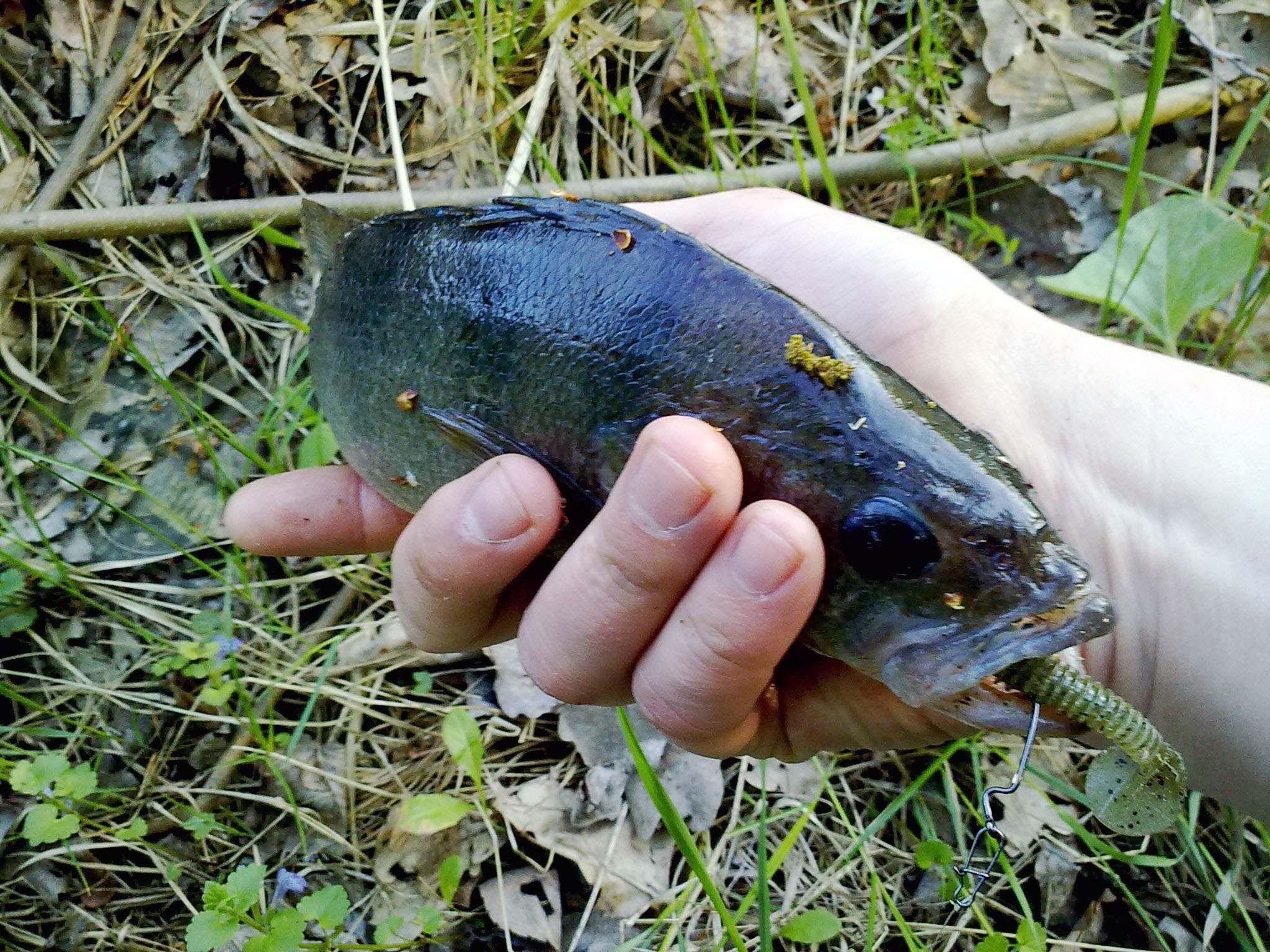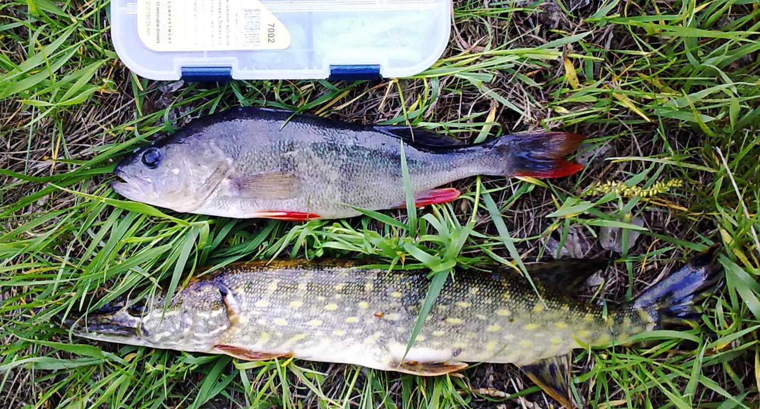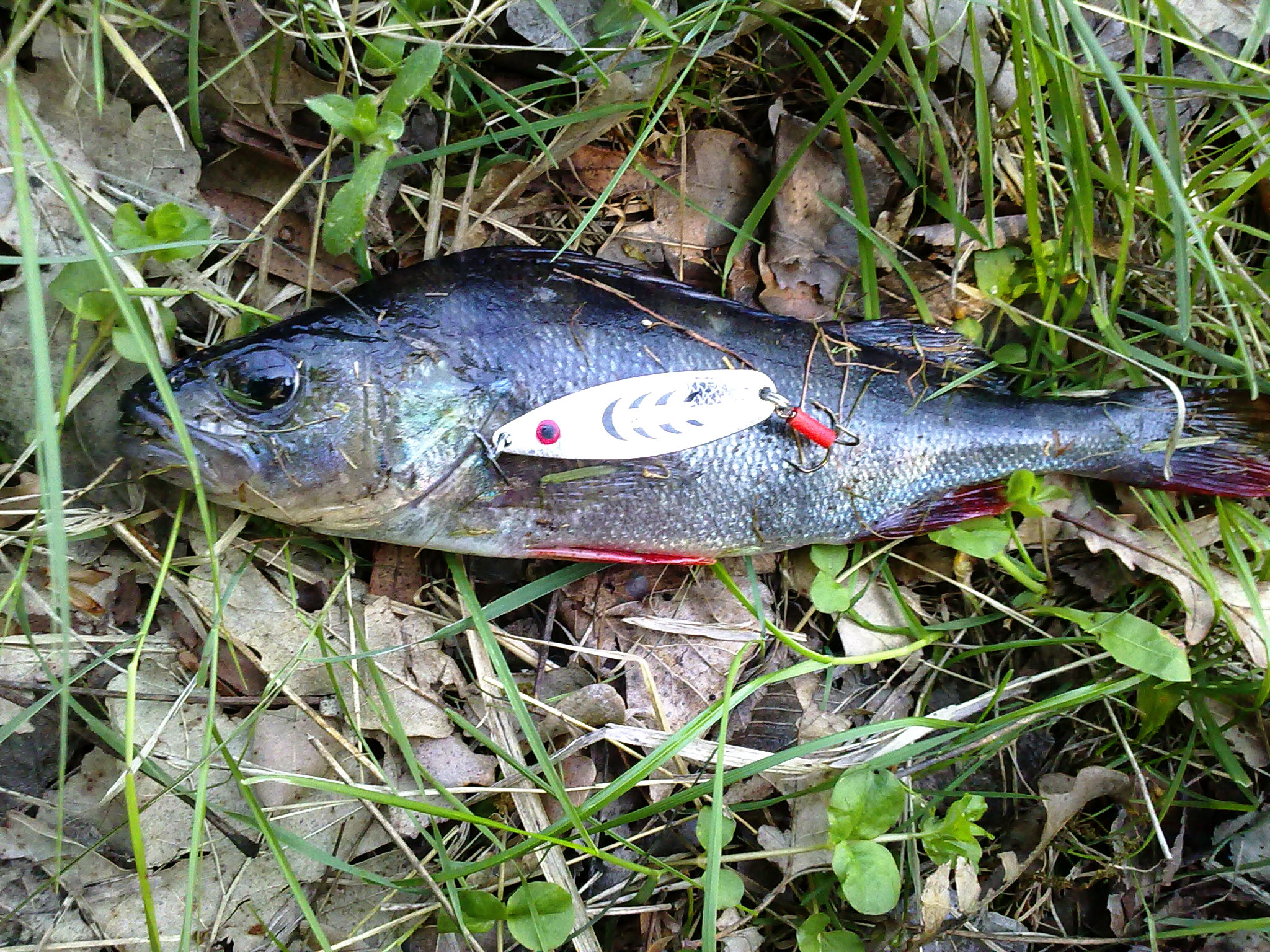 Брал реванш у щуки. Сегодня не проспал и с зорькой уже на берегу. Взял одну жадную - приманка аж в жабрах (ели вытащил). Кстати только вытащил её на берег, как тут же она срезала флюр. Половив еще, взял хорошего окуняру на Keitech Swing Impact Fat 2.8" :1_0072: