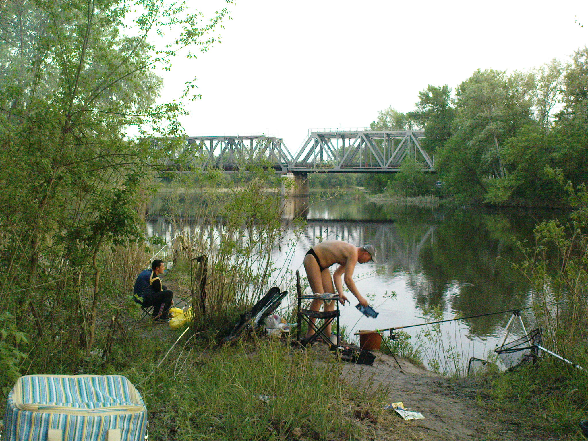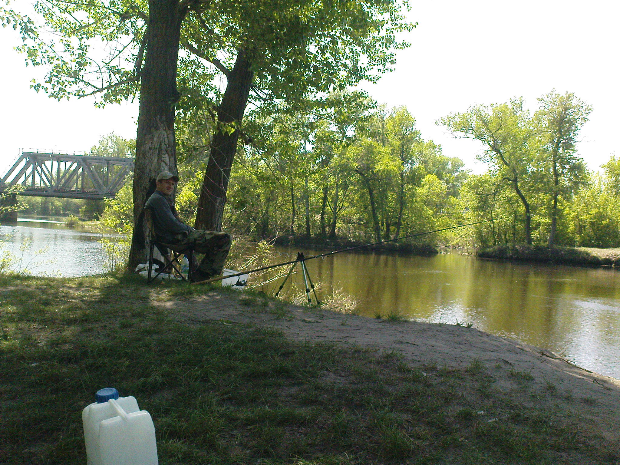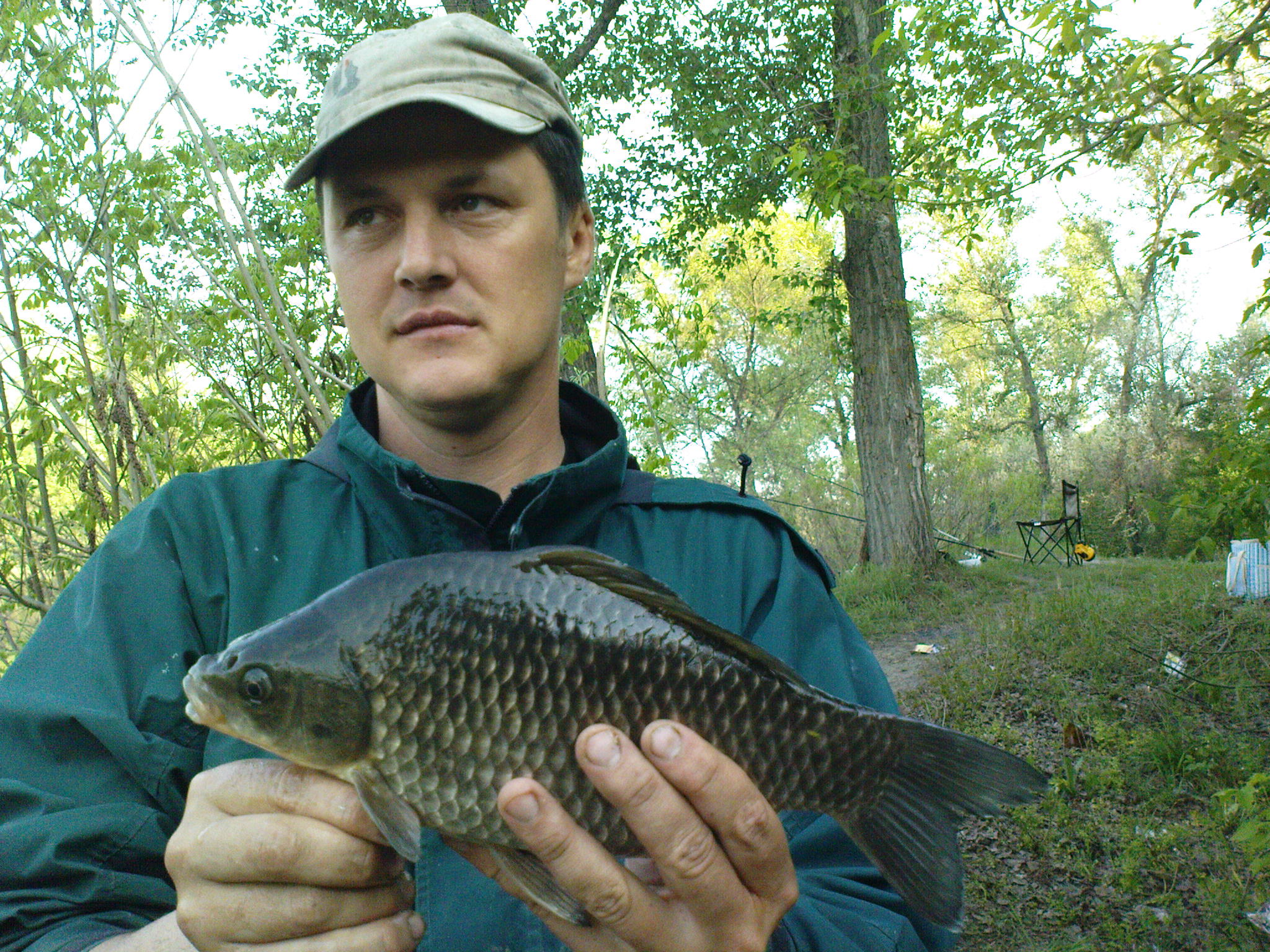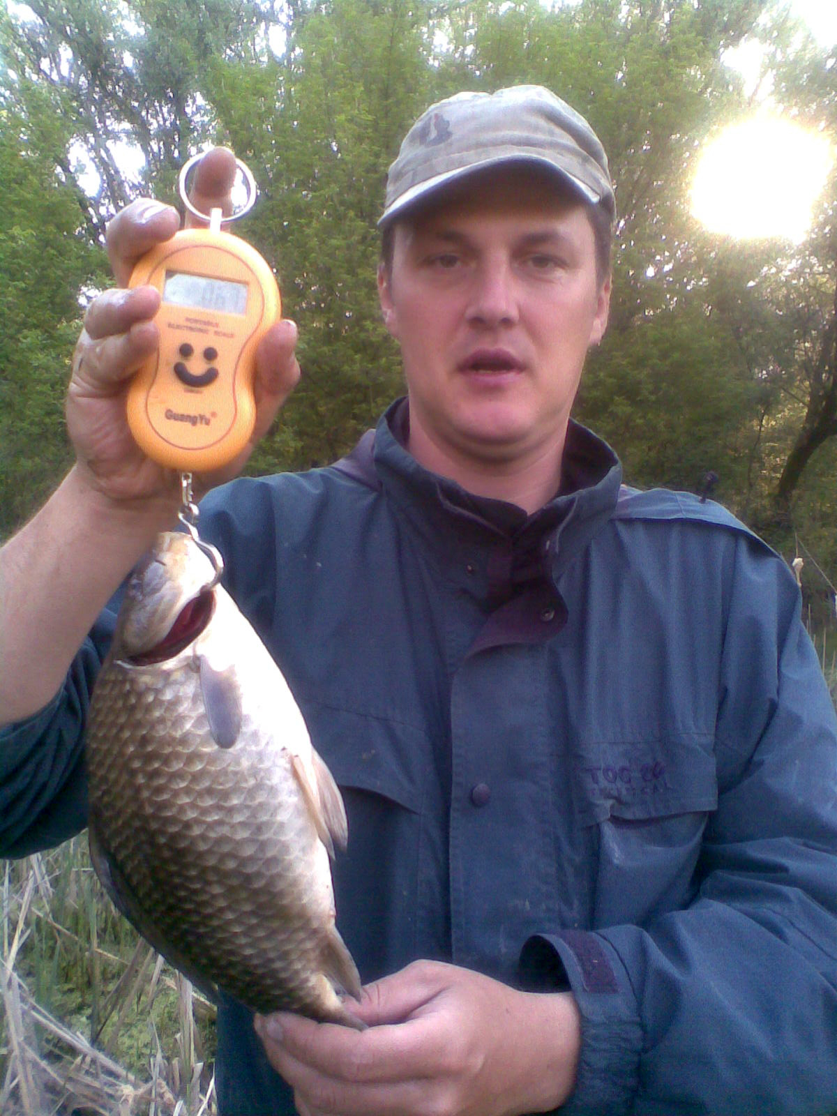 Пять выходных! Т.к. домашние дела ни кто не отменял, то первые три выходных занимался по хозяйству, хотя и вырвался на псел на пару часиков на разведку. Карась начал отзываться. И вот на 1 мая выезжаем с Женей (Моторатором) и Саней (Трианоном) в Щербаки за жд мост. Приехали еще засветло, обновили Сашин столик – классная вэщ-щ-щ! Как начало светать стали настраивать снасти. В месте лова Псел широченький, поэтому беру не пикер, а свой любимый фидерок микадо УВ, в длине 3,60 и тест120 грамм. Промеряю дно, уклон идет под наш берег, Посредине нахожу нервность, глубина около 3 м. Кормлю запаренной макухой + ФД карп микс, наживка опарыш, красный червь. Первым отличился Женя и вот у него уже в садке красуется карась грамм 400. Потом поклевка у меня и также карась появляется в моем активе. Третьим отличился Саша, у него ловились в основном трофее под кило. Поклевки хоть и не частые, караси очень красивые, так же в прилове попадалась густера, плотва и краснопер. К вечеру подтягивается Юра Гаврила и Олег Коротя. И тут у меня случается поклевка с провисанием шнура. Не может быть!!! Да, это он… ЛЯЩЩЩ!!!!!. Лещик затянул на 1040 грамм. Вечером была уха и задушевные разговоры. Ночью ставил снасть на сома с поплавком, но сом не отозвался.