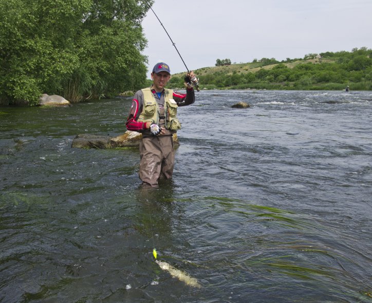 Двое спинингуев и один нахлыстуй облачились в вейдерсы и рванули на нижний перекат, а я остался в лагере возле слива с верхнего бурла. На одном местечке, где струя раздваивалась и огибала остров, была интересная бурлилка с затишком. По границе с затишком начал под разными углами к течению и с разной скоростью ганять кислотного Чабика. Поскольку щуки в тех краях не редкость, а кислотные расцветки это её эрогенная зона:стыдно:, то поводок из 0,52 флюра был поставлен сразу. Но вместо не желательной зубастой бестии получил подачу очень желанного трофея зубастого-щеткастого, про поимку которого в порогах Буга я мечтал с 2010 года.