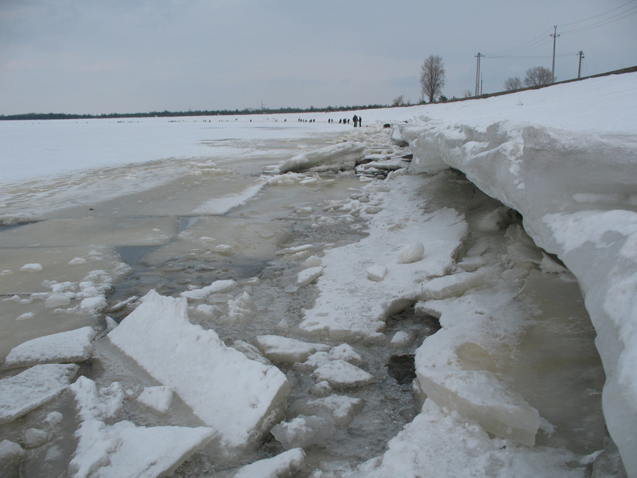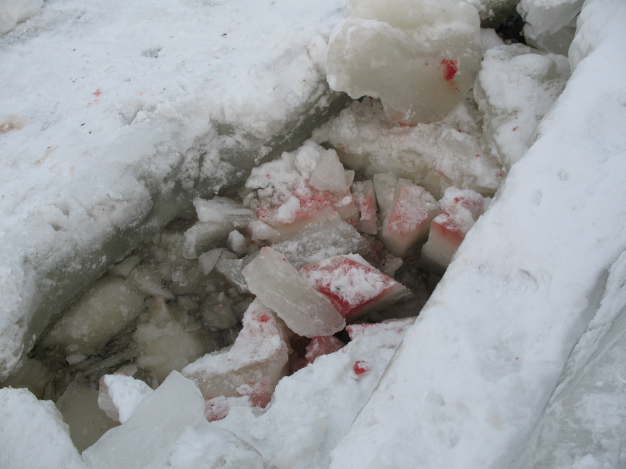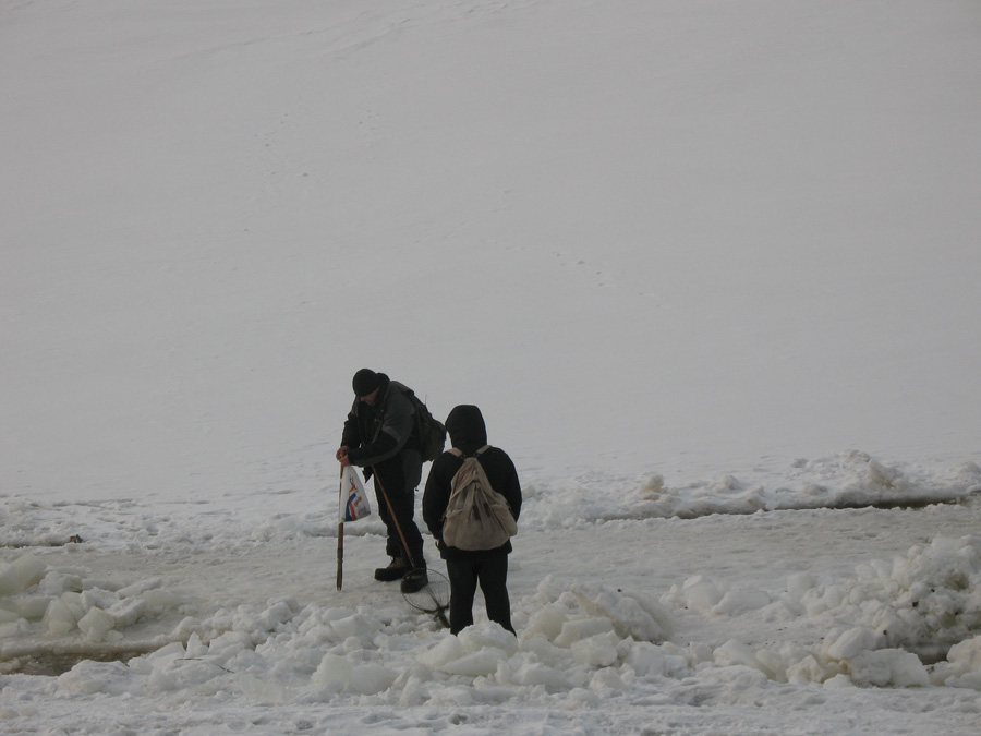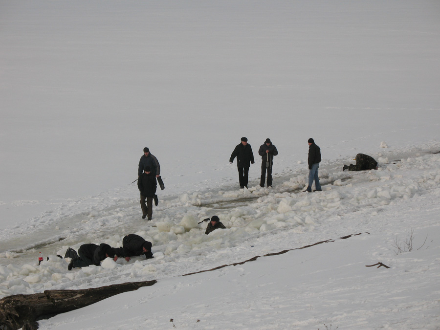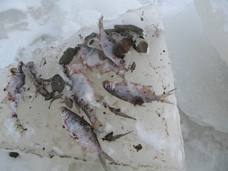 Слов нет, чтобы описать ситуацию, которая сложилась на Киевском водохранилище. В результате попыток властей "спасти" рыбу от задухи, было принято решение резко поднять уровень воды на Каневском водохранилище, чтобы поломать лед и дать возможность рыбе дышать. В итоге, уровень воды на Киевском водохранилище был понижен около 1метра, в районе Киевской ГЭС, что отчетливо видно по ледяному излому. Рухнувший лед придавил рыбу, подошедшую к берегу за "глотком воздуха". Ну и как обычно, не обошлось дело без мародеров, которые выкидывают на лед уцелевшую рыбу, которая подплывает к ледяным трещинам за спасением. Там ее действительно "спасают", кто - чем. Кто подсаком, кто багориком, кто руками, а кто самодельным гарпуном или вилкой. :dewka2: