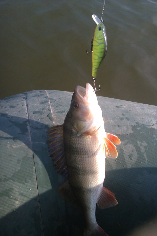сегодня , 5 сентября , шахтные разливы , на пару км дальше чем 2 сентября , подъезжаю на место на котором наверное не был лет 10 , мужик на таксоне качает лодку , мужик оказался общительный , рассказал что и где ловится , выплыл Я около 7 утра , похода тёплая , легкий ветер , пливу в то место , в котором по мнению мужика хорошо ловится окунь , пробую ловить - не ловится , на 20-30 забросе следует удар и далее вываживание , вываживал минут 5 , подсаки как обычно нету , поэтому пришлось брать рукой , взял , дома взвесил - 2.5 кг , далее поймал ещё 3 небольших окунька и попер домой .