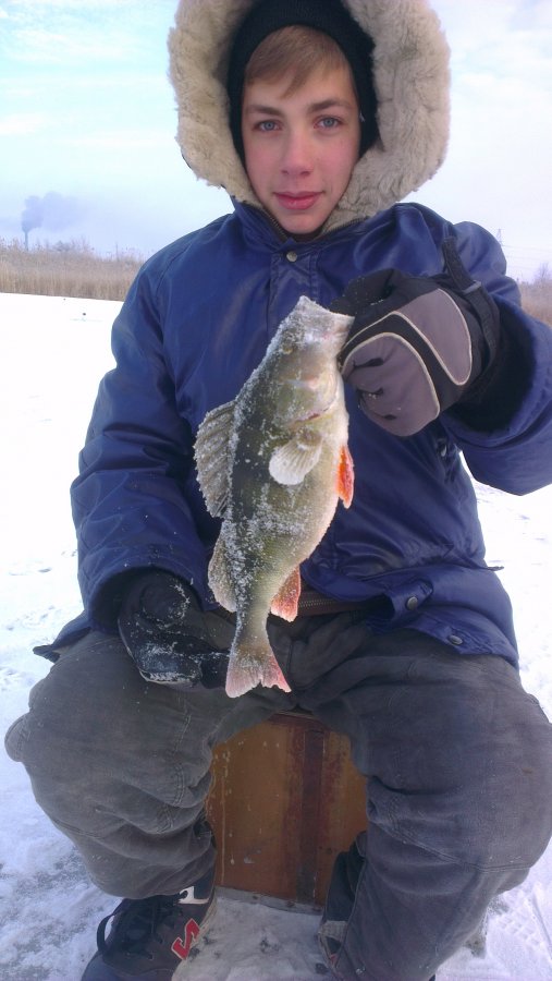 Всем доброго времени суток! 17.12 Наконец то удалось вырваться и открыть сезон твёрдой воды:ura:,напарники в отличии от меня уже были на льду,а я так сказать в первые в этом году.):cold:Решаем ехать в сторону ЦОФА и пробовать поймать зубастую на жерлицы.Приехали затемна расставились и стали ждать,мороз,свежий воздух,трескающийся лёд от мороза,КРАСОТА:zachet:.Первая сработка у товарища случилась в начале 9-го,результат щупак на 1,700. Тем временем в ожидании загоревшихся флажков решаем половить на мормышку,окунёк начал поклёвывать,даже было поймано несколько не плохих плотвин,но героем дня стал студент поймавший на черта окуня на 498г