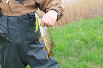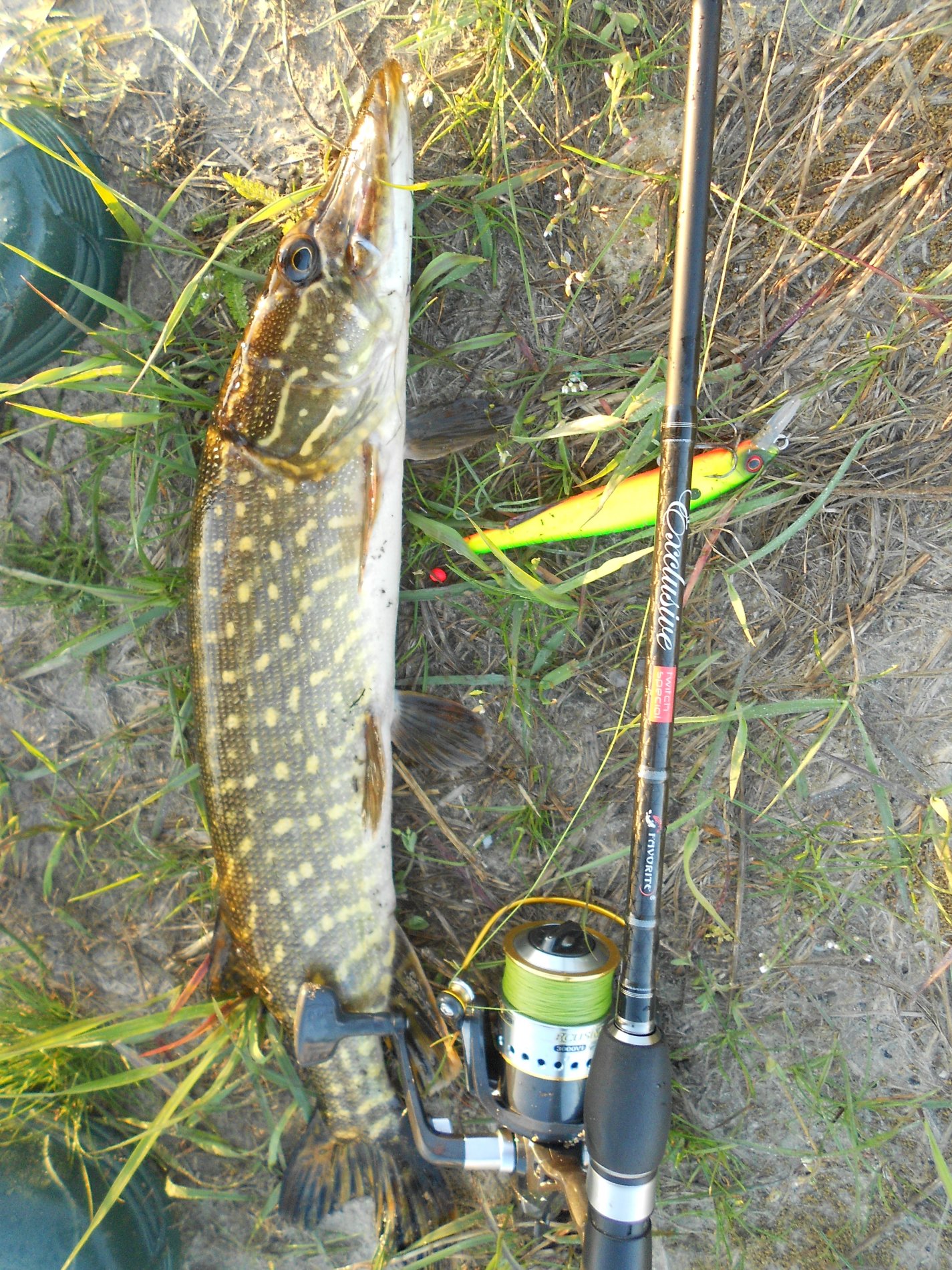 Получив вчера новый спин решил что с утра нужно ехать испытывать. Батя, решив что искать зубатую рано, вооружился поплавчанкой. Щука с самого утра не проявляла активности, но мне хотелось узнать как палка дергает воблерки, на улов почти не расчитывал. На одной из проводок происходит жадный удар, и понеслась, закилушка на берегу, сезон открыт:predator: