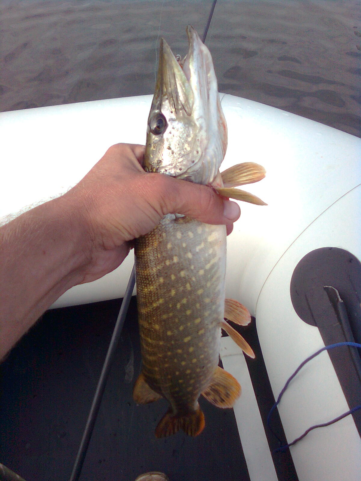 Буквально через 10 минут на этом же месте ударчик посильнее, начинаю подтаскивать. Возле лодки начались акробатические этюды. Щучка не большая- около кило. Так меня это зрелище увлекло, что я решил не форсировать события, дабы насладиться цирковыми номерами. В общем держал, водил - очредная свеча и была такова:D