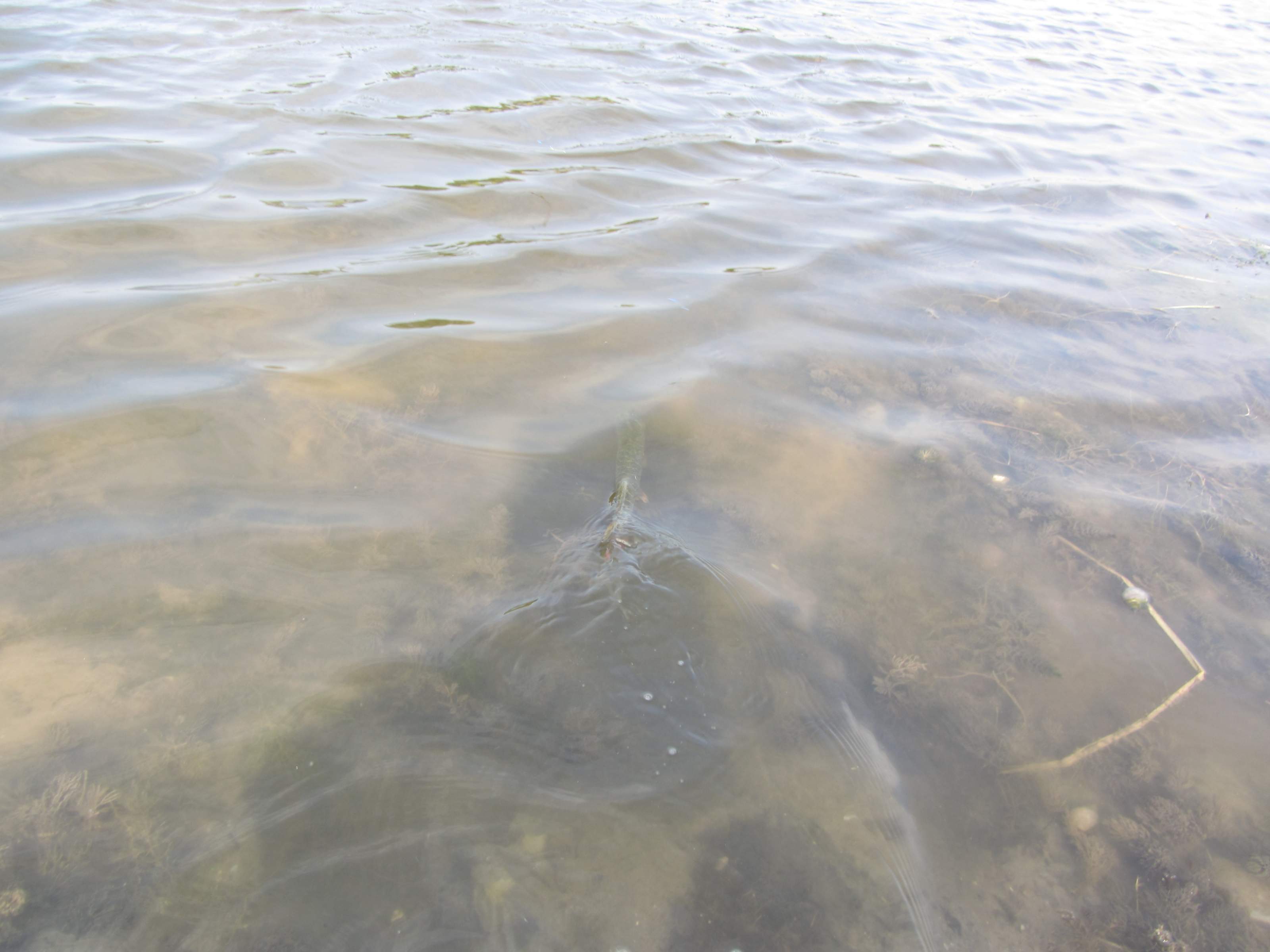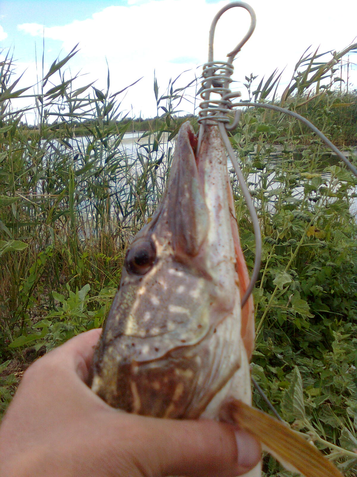 Слева и справа от нас спиннингисты выловили по щучке. Тогда мы с другом тоже начали баловаться, сняв пружины и надев блесны. В течении 3-х часов друг поймал четыре щучки, и все на одном месте. Визуально две точно зачетные, а две под вопросом. Весь день дул ветер.