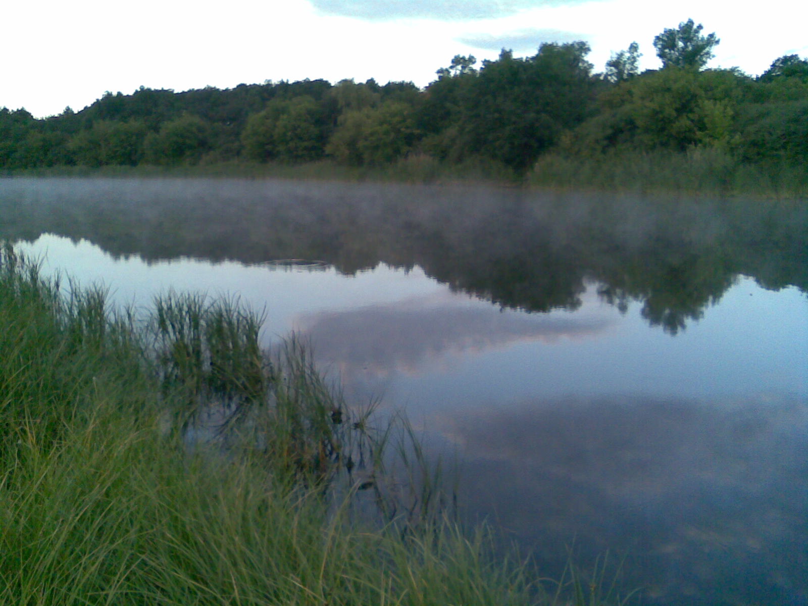 В 7.00 на воде. Утро прохладное, даже чересчур, небо покрыто облаками. Единственным отличием от вчерашнего дня было то, что ветер так и не задул. Полный штиль, а часов с 10.00 началась парилка. Вся мелочь наверху хапает жадно воздух. Кое где на поверхности опять выскакивали окуньки, но брать отказывались.