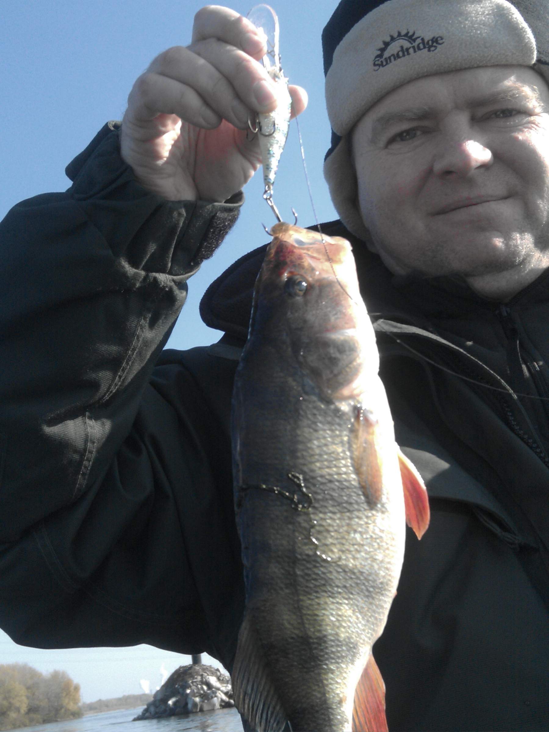 Я ездил "консервировать" на зиму свою дачу и на пару часиков выскочил вечерком на воду в районе Редутов, то лодки знакомых мне судачатников стояли, но результат слабенький: на куканах висело у кого 2 у кого 3 судачка весом не более 1,5кг. Я грузов тяжелых не брал с собой а чисто решил потролить по Днепру и по своим заливам и взял всего 1 судачка, 1 щучку и 1 окуня. Окунь приятных размеров, поэтому его сфоткал на память