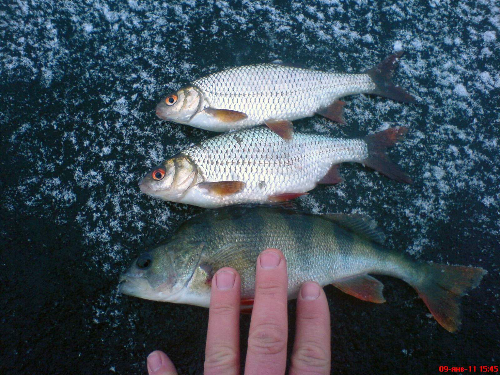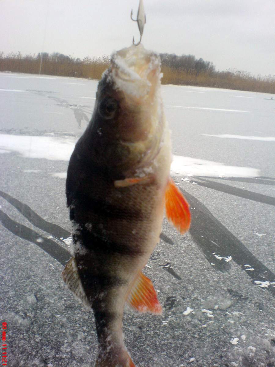 Придя на яму и расставив жерлицы, принялись ловить окуня. Я ловил на блесну и мормышку с мотылем, товарищ на балансир. И вот срабатывает первый флажок. Кореш был ближе всего, и вот на льду зачетная шучка. Меняем живца (ловим на купленных карасиков) и продолжаем ловить окуня. Опять отличился кореш и у него с одной лунки вытягивает сначала хорошего окуня, а потом и щучку. Меняю свою блесну на балансир и потихоньку из лунки достаю своих окушат. Под конец дня, еще сработало 2 жерлицы и зачетные щучки опять на льду. Уже начинало смеркаться и пора сворачивать жерлицы. Я оставляю в лунке мормышку с мотылем и удочку ложу на лед, краем глаза вижу поклевку, подсечка и хорошая таранушка извлекается из лунки. Еще заброс и жду на «стояк» поклевка и окунь на 150 грамм (показали эл весы) на лесочку 0,1 опять на льду, еще заброс и опять тарань. Плохо, что заметил, как нужно ловить под конец дня. Ну да ладно. Это была разведка боем.