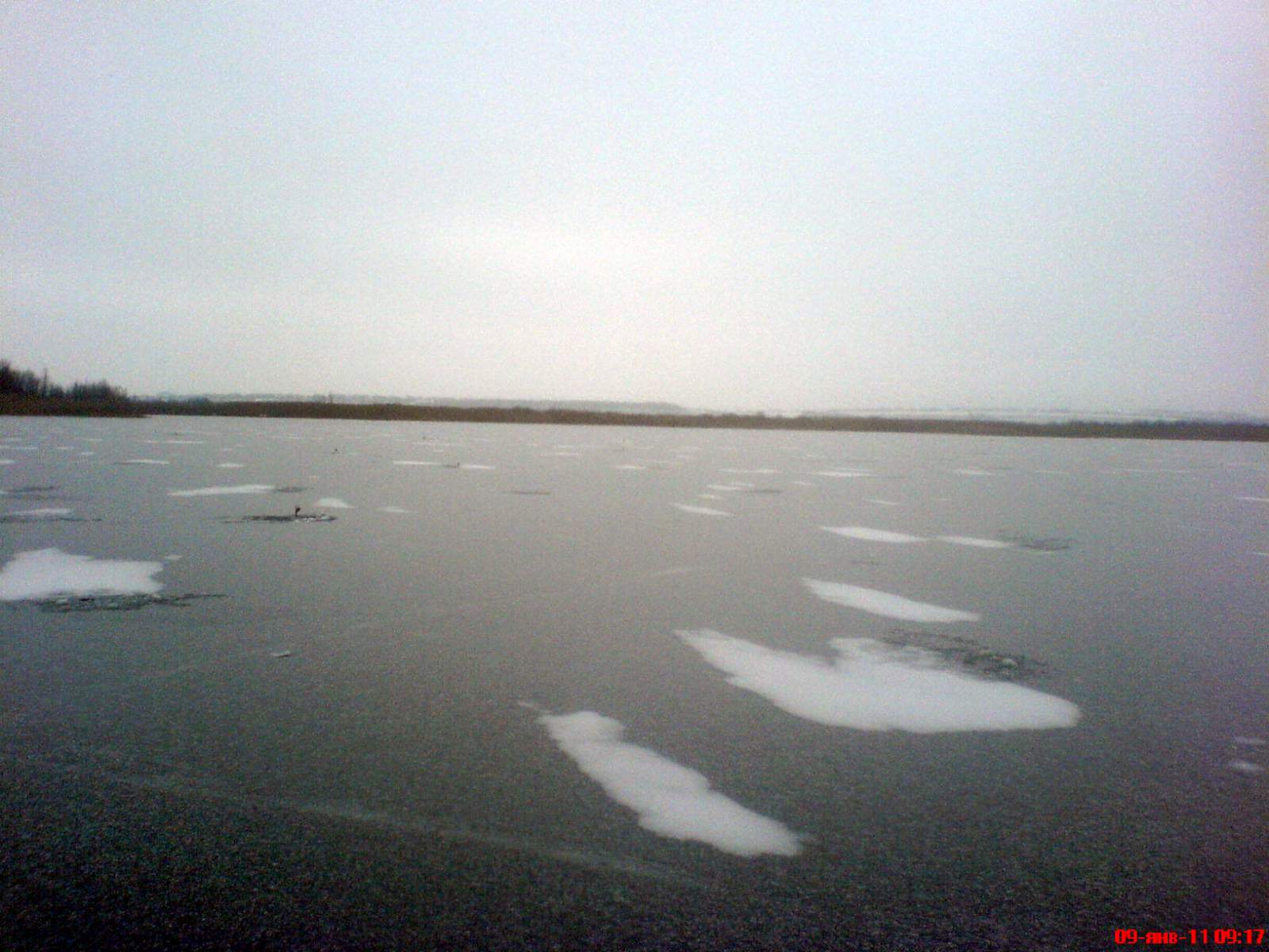 Приехав на место, машин уже было полно. Лед был крепким, толстым и как стекло прозрачный. Видно было дно и кувшинки. Но погода нам помогала, пошел снег и прикрыл прозрачный лед.