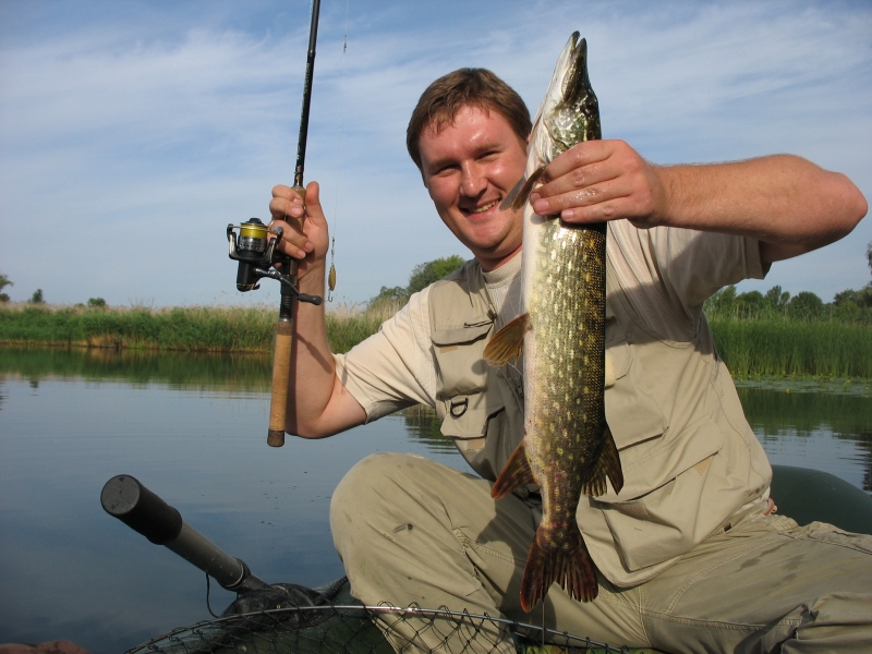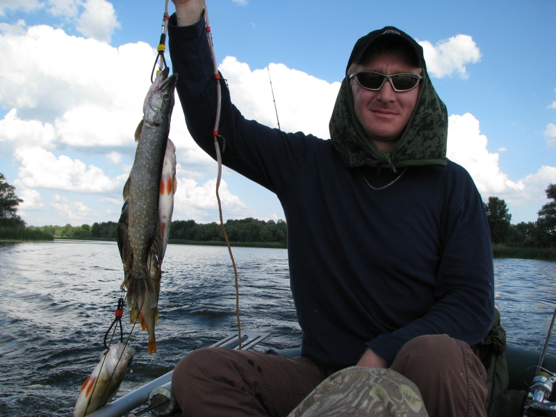 Утром где-то в течении часа удалось выловить по несколько хороших окуней на бросок, Сережа SCH взял на дорожку щучку-килушку, мне под кувшинками посчастливилось на мепсовскую аглию лонг 1+ взять до пары на 1.5 кг. Флюрокарбоновый поводок почти не пострадал, только добавил адреналина при вываживании. У коллег, Юрия Ивановича и Сергуна, дороживших в это время на моторе, результат оказался не лучше нашего. Несколько окушков и отпущенная подрастать щучка. В принципе на этом клев и закончился. Приплыл мой братишка - Костик кокс Пообедали, проплавали еще несколько часов, дорожили. пробовали на бросок, перепробовали массу приманок и все безрезультатно. Довольные и отлично отдохнувшие возвращались домой. Всех с прошедшим днем рыбака!