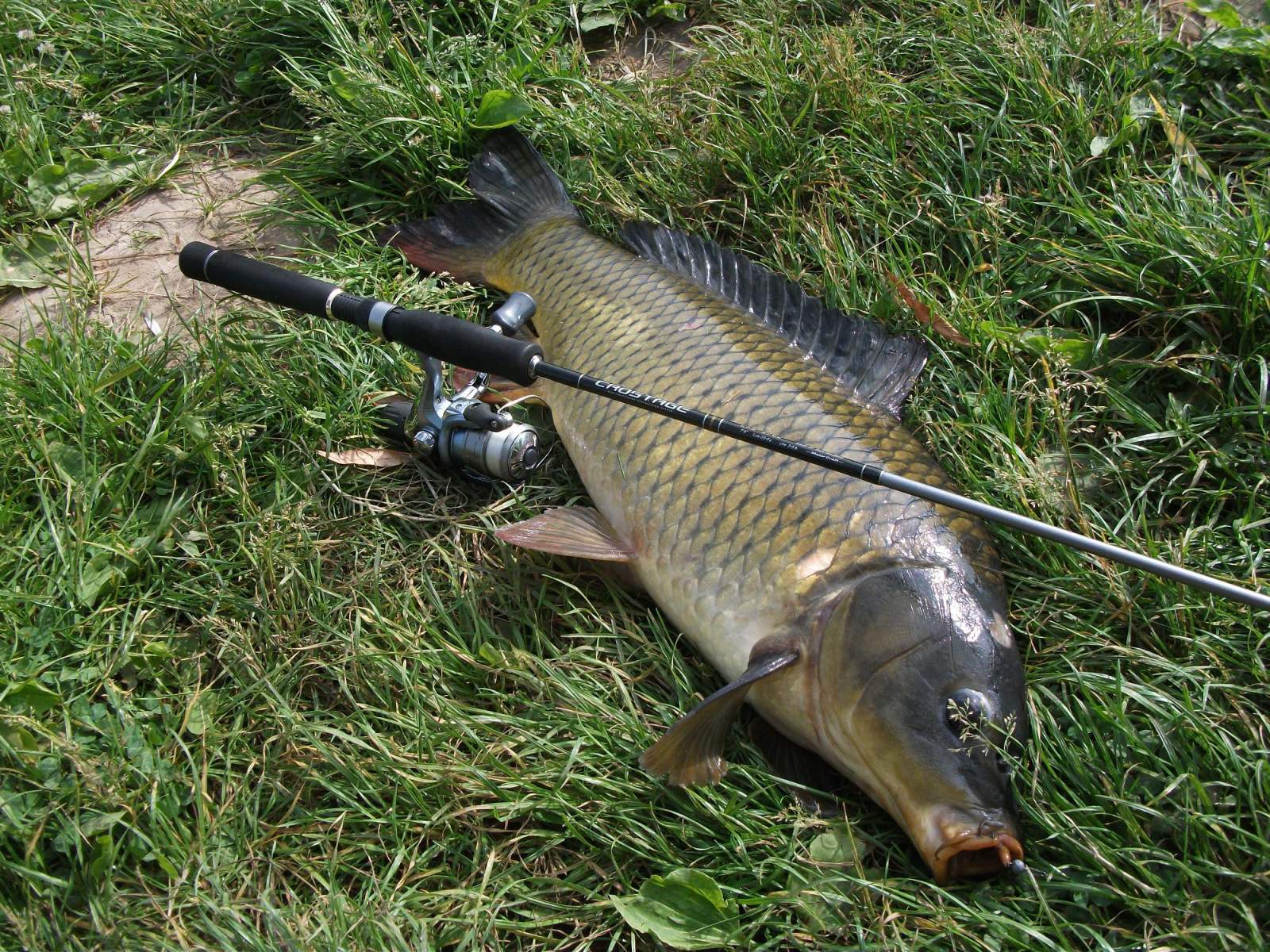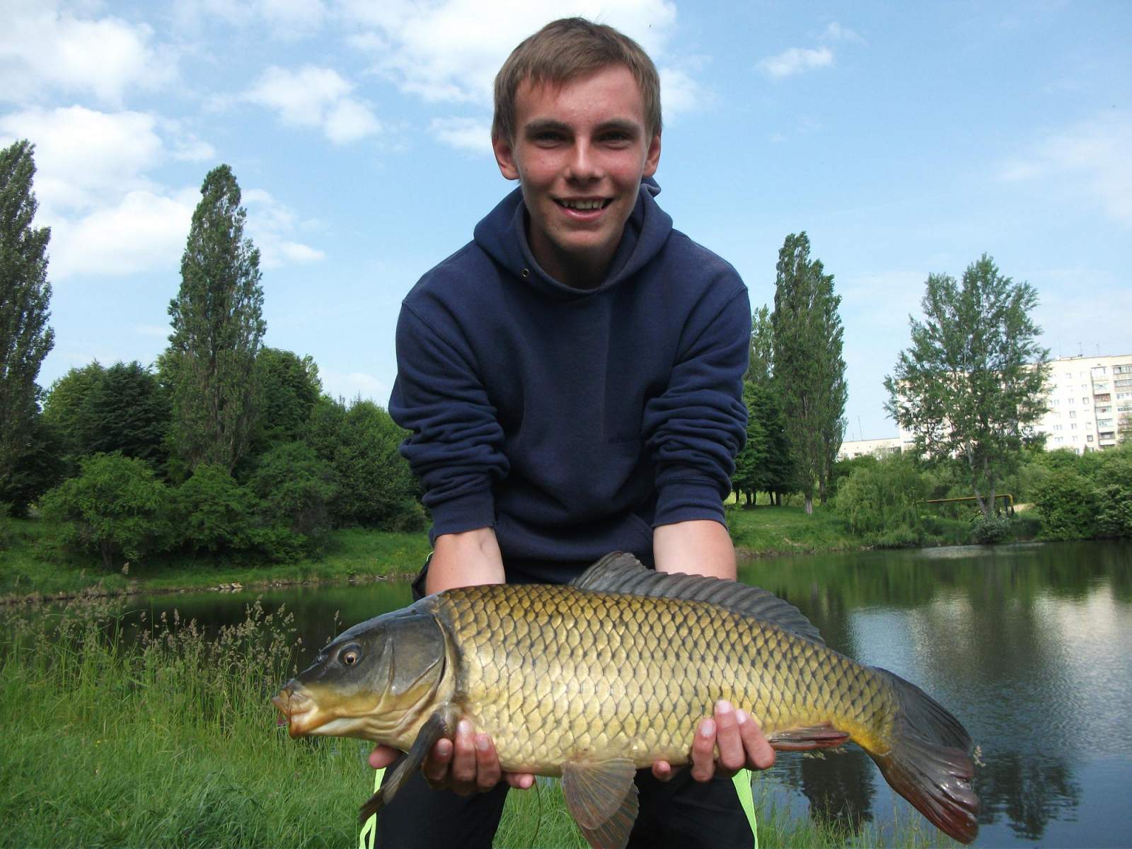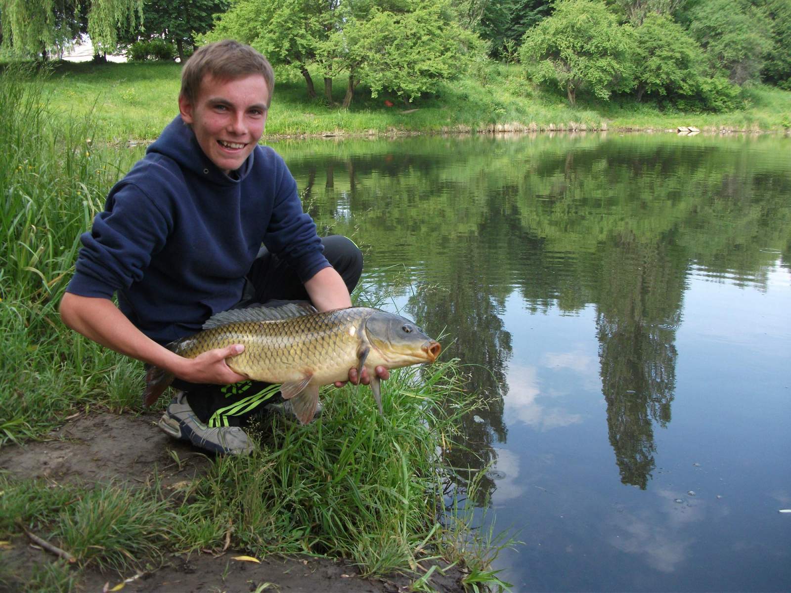 Монстерським рибом виявився короп. Діма вже його трішки приморив, та рибка не збиралась здаватися. Після 40 хвилинного виважування, мені, стоячи по коліна у воді вдалося взяти руками змученого коропа. Риб виявився не маленьким. Клюнув він "чесно" на 35 лоха. Виважуваня здійснювалося на 0,12 моно!