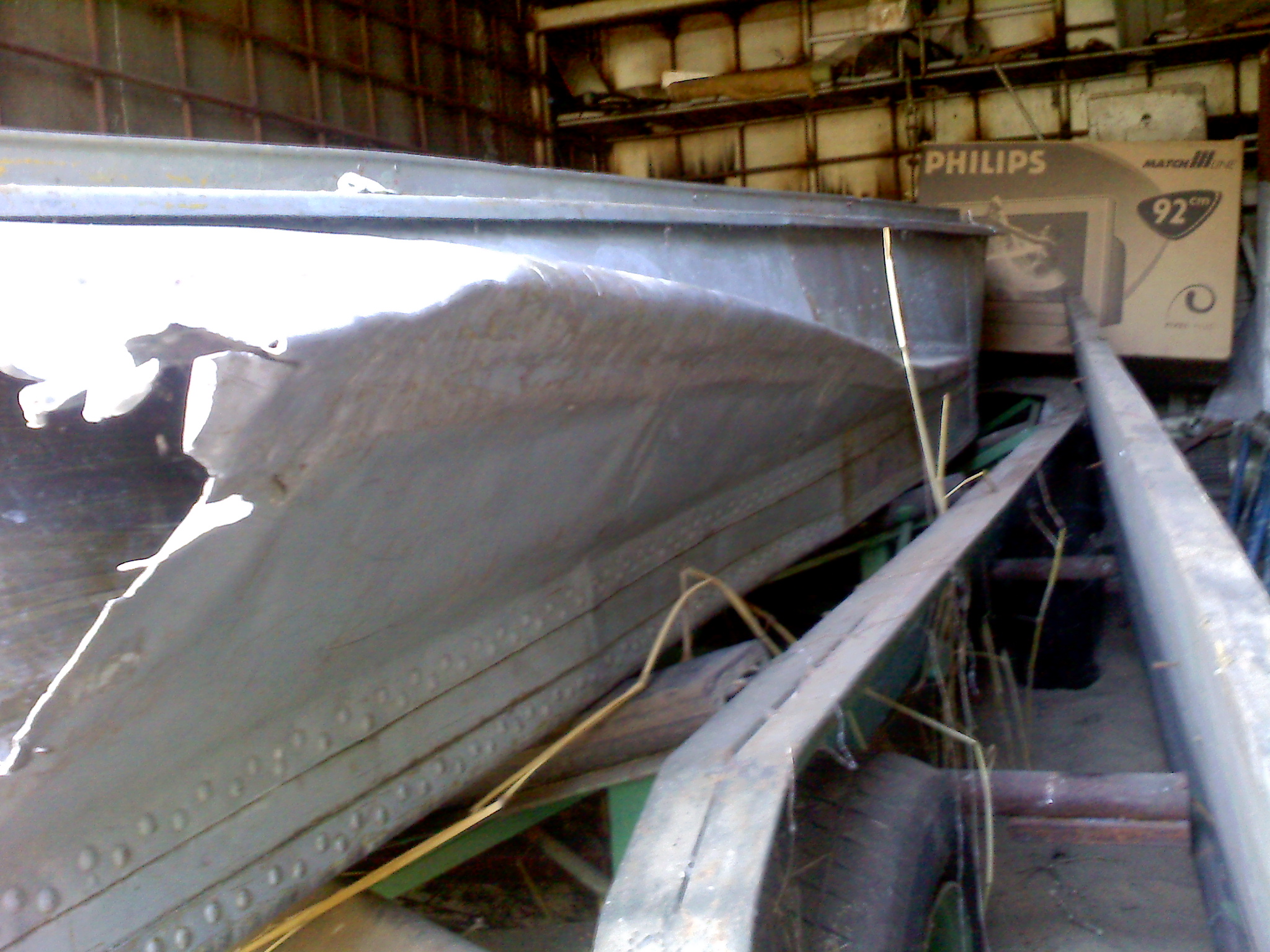 Если левая часть целая то на правую можно поставить латку и стянуть заклепками. Особых проблем в этом не вижу. Если снимать були то придется заделывать по правому и левому борту все дырки от заклепок или резать турбинкой.