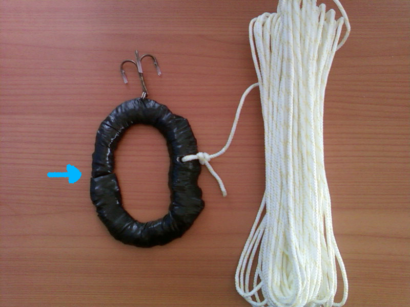 На фото стрілка вказує на проріз у який заводиться шнур,леска. Грузило обмотав багато разів ізолентою щоб не перетерло шнура. Плюс такого виробу - можна без проблем витягувати сітки :) Це чорновий варіант і після опробувань можливо буду доробляти.