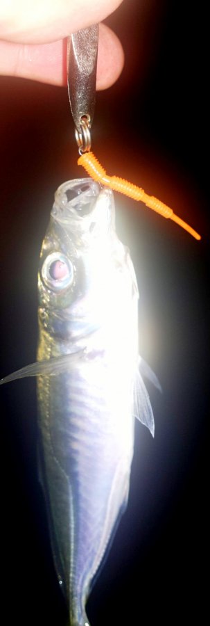 Вовсю гуляет сарган - тут и там видны всплески мелкой рыбёшки, которую он гоняет. Сарган некрупный, ловить его просто жалко.. А сегодняшнюю ночную рыбалку сделал простой китайский Cast Master с подсаженным на крючок силиконом Mebaru Bushi от Jackall Br.