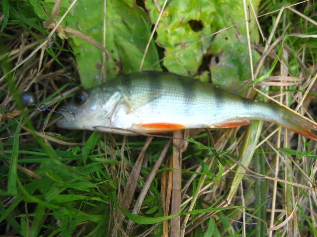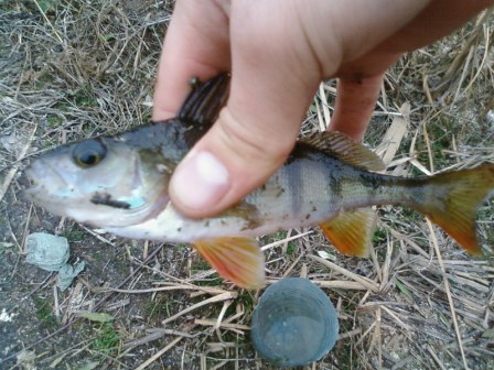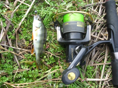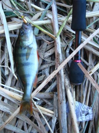 час ноль, два часа - ноль и минус один тейл-спиннер на отстреле, заглядываю в коробочек с грузиками, а закончились 10 граммовые и кризис жанра на лицо, т.к. 8 гр не летит по такому ветру (а он к слову был такой, что из трусов выдувал), а 12 для данного водоема за гранью весов я считаю. Но осеняет и в кармашке рюкзака нахожу смонтированную приманку и о счастье на 10 граммах. Поменял прицепил, нужно и перекусить. Перекусил и решил пройтись попробывать хоть окуня намикрушить. И вот он окунек на дюймовый Manns с 1,75 головкой еле еле зацепившись выброшен на берег и сразу падает, но уже на берегу и никуда не денется.