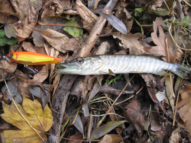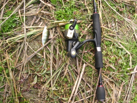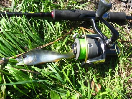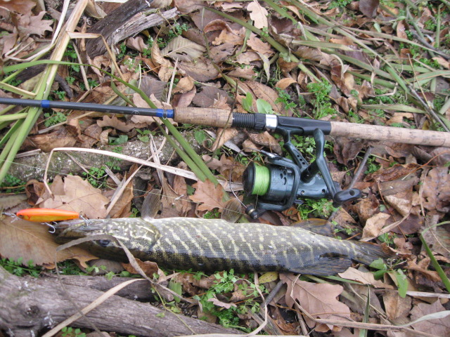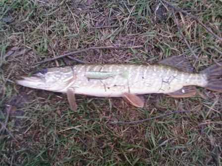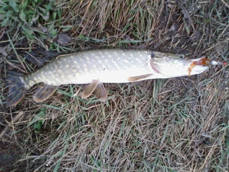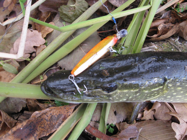 Потом решаю попробывать обловить свежекупленный Shaker и начал облавливать выходы из ямы и в 14.50 примерно четкий "выстрел" в руку подсечка честно на автомате получилась, я сначала подсек, а потом начал понимать что я сделал, но факт остается фактом подсек то вовремя и очередной щукарь медленно (на Ул все-таки), но уверенно отправляется к конечной станции "берег". вытянув ее на берег расстегивается застежка от Owner (самая надежная по независимой экспертизе 8)) и щука чуть не упрыгала от меня, но курящая оказалась(на фото будет) и была догнана. В ней 750 грамм и она блаполучно сфоткана и отпущена, т.к. с икрой, а и рыбалкой доволен (рыбу летом поедим, а сейчас по идее все отпускать надо, ведь на следующий сезон тоже половить хочеться)
