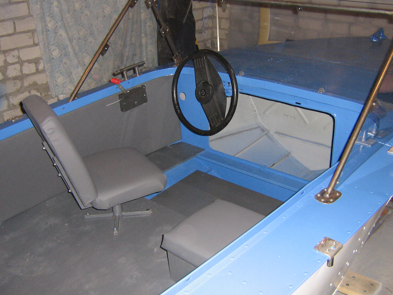Просто ВСЁ делали вдвоем с братом, включая и покраску. Из затрат: 1-краска, 2-офисные кресла, 3-бакелитовая фанера (6 и 9 мм по 1 листу) 4- один метр нерж. трубы, 5-рулевая колонка от мазды (выброшенные 30$), 6- 7- 8- ......... расходники. Плюс то, что имелось в наличии (кожзам, заклепки, дерево, ИНСТРУМЕНТ)