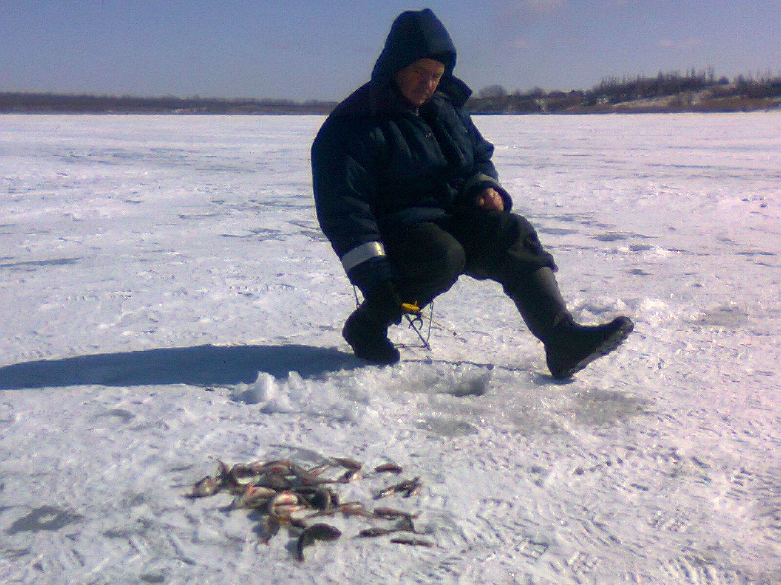 Как это не смешно (см. предыдущий пост) выглядит,но этот отчёт называется "Закрытие сезона зима 2010" !!!Врагу такого не пожелаешь: всего два раза за зиму на рыбалке побыл,но так видно было угодно судьбе в этом году....Итак,то же место,та же цель: половить рыбки,отдохнуть + провести уже полноценно зиму! В 6:00 на месте,на этот раз по совету знакомых,я и мой постоянный спутник в таких мероприятиях - Отец,решили остановить свой выбор на более глубоких местах,а именно в районе турбаз!Первые 1,5 часа ловли - активный поиск хоть какого-то представителя местной ихтиофауны!Постепенно перемещаясь по направлению Зелёновки вынимаем по Ершу.Картина ,мягко говоря не впечатляющая,НО!Уже на следующем,так сказать,"привале",я на первой же проводке вынимаю мерненькую Плотвичку,после чего подходит Отец и,не успев ещё снять рюкзак,выуживает из соседней лунки экземплярчик,без малого в 0,5кг!!!Решаем задержаться,как оказалось позже до самого "финального свистка"!Итог: До 14:30,не считая промежуток полного безклёвья где-то с10:30 до 13:00!!! нами было поймано около 3,5 кг Плотвы разного калибра и несколько Матросиков-недомерков,в последствии утопленных!Что хочется отметить,так это то,что почти вся рыба поймана на неподвижную мормышку,со дна(мотыль естественно)!Удивило так же отсутствие полосатого разбойника,который тут водится в избытке,да ещё и весьма солидных размеров!Ну,вроде,всё написал,что знал!Да!Чуть не забыл,лёд ещё толстенький (прим. 40см),но уходит на глазах,у берега чуть не искупались!!!)))))